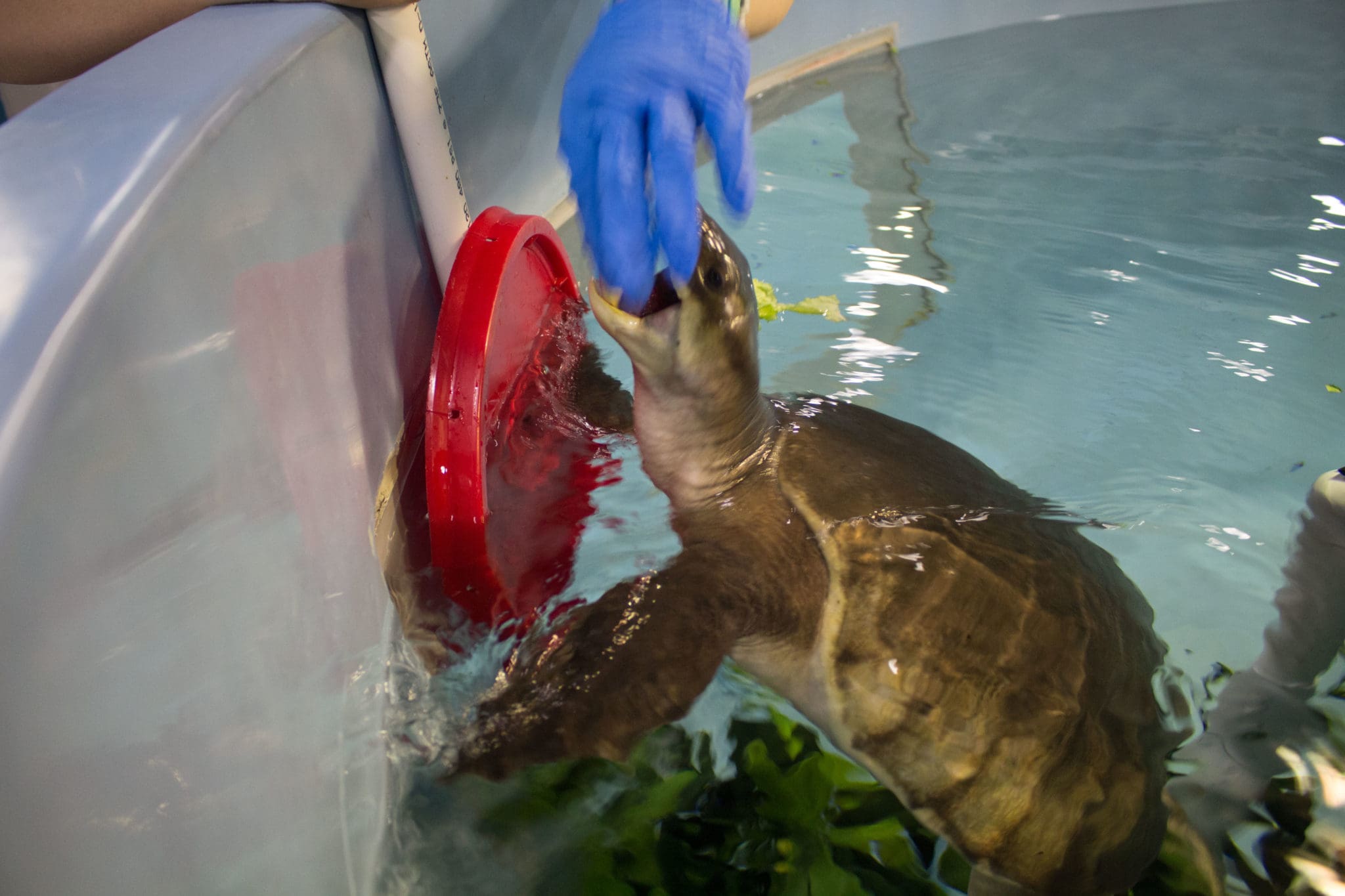 Once the training was done and best rescue procedures were thought of I went to work with some of the team with the ACRC, including Meredith Myers. She helped me prepare food for some of the animals housed on exhibit or in holding, these included lungfish, a cowfish, a map puffer named Duncan and many turtles. I went around to the tanks feeding some of the turtles throwing allotted amounts of lettuce into the tanks. One of my favorite turtles is a pig nosed turtle named Funzo, this species is the only freshwater turtle with fins.