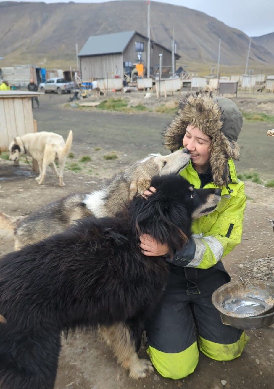 Today we boarded the ship! This morning, I woke up early to pack up all of my gear before check-out time. I signed up for the dog-sledding experience, so at 9am I was a part of a group that got driven to the dogsledding company’s kennel down the road from Longyearbyen. They have 131 dogs there, and they were all super happy to get pets from new people. Once we had greeted and pet the dogs for a bit, we were shown how to put the cross-back harness on them and hook them onto the lead. Each of the dogs we were told to harness were so excited to be getting ready to run, it was really cute! Once all five sleds were set, I released the brakes and the dogs started to pull us along, as I (and each of the other drivers in our groups) followed our guide up and down the dirt roads. We passed one of the old coal mines too, where the soil turned black with all the coal that had been deposited there. The scenery was so picturesque, and it was so much fun to be driving around with these dogs in such a beautiful place!