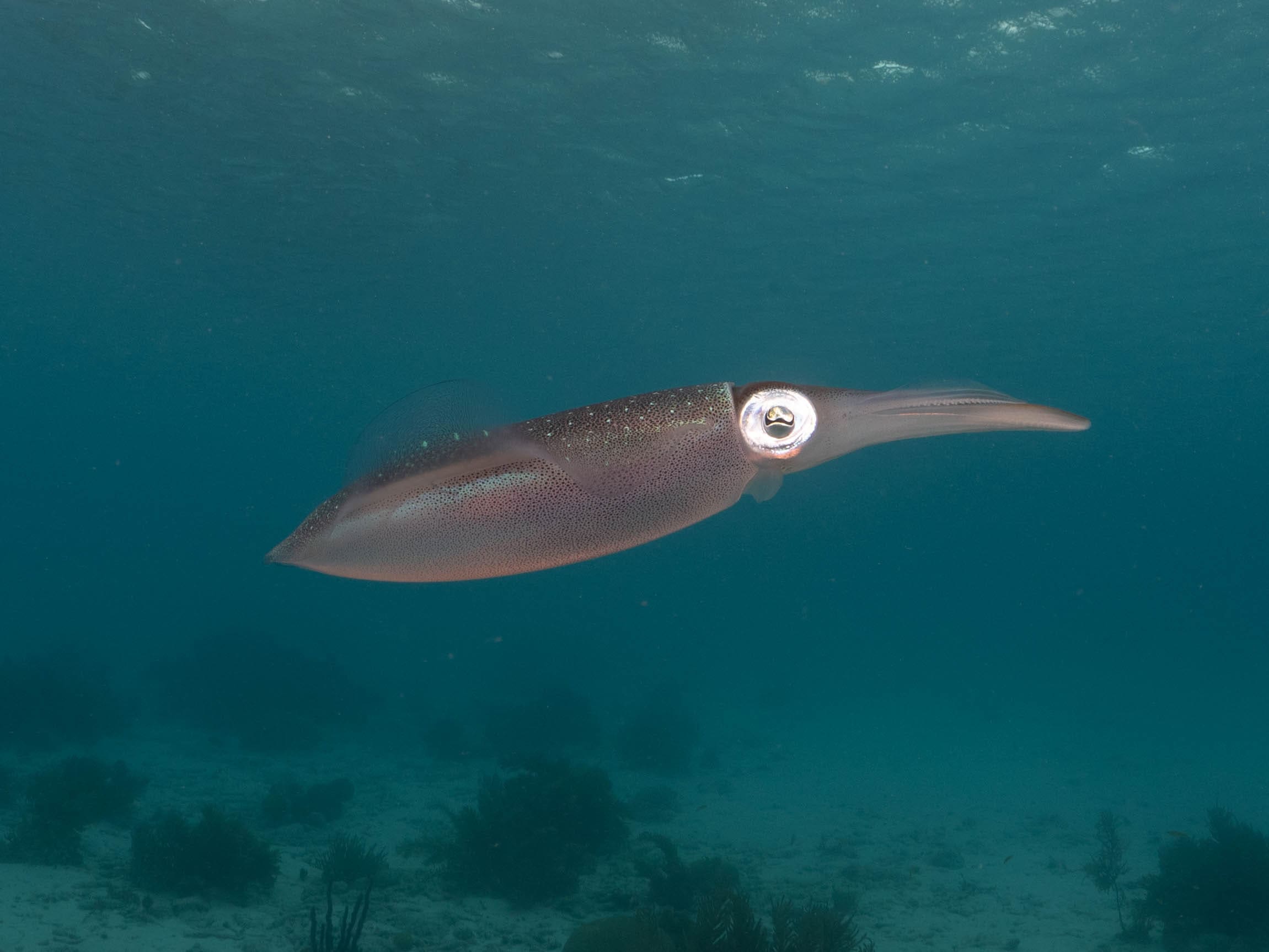 Today’s boat headed first to a dive site called Alice in Wonderland, and then back to Angel City which we had explored a few days prior. I was back to using a wide angle lens, and the first dive at Alice in Wonderland was fairly uneventful. I practiced lighting sun balls, and slowing my shutter speed to see what type of movement I could get in the photo. After a surface interval, Russel and I buddied up and explored Angel City. About 35 minutes in, we were pretty shallow and came upon around 40 squid! It was just us in that area so we had plenty of subjects and I wasn’t worried about getting in anyone’s way. While I was shifting some settings, I saw a spotted eagle ray out of the corner of my eye. It was beautiful! I tried to get Russels attention but he was focused on his camera, so I was able to shoot the ray alone. At first my settings were way too bright, but luckily the ray stayed for a few minutes and I was able to change them and get a better shot. I was happy that I was shooting wide angle when I saw the ray instead of macro like the day before!