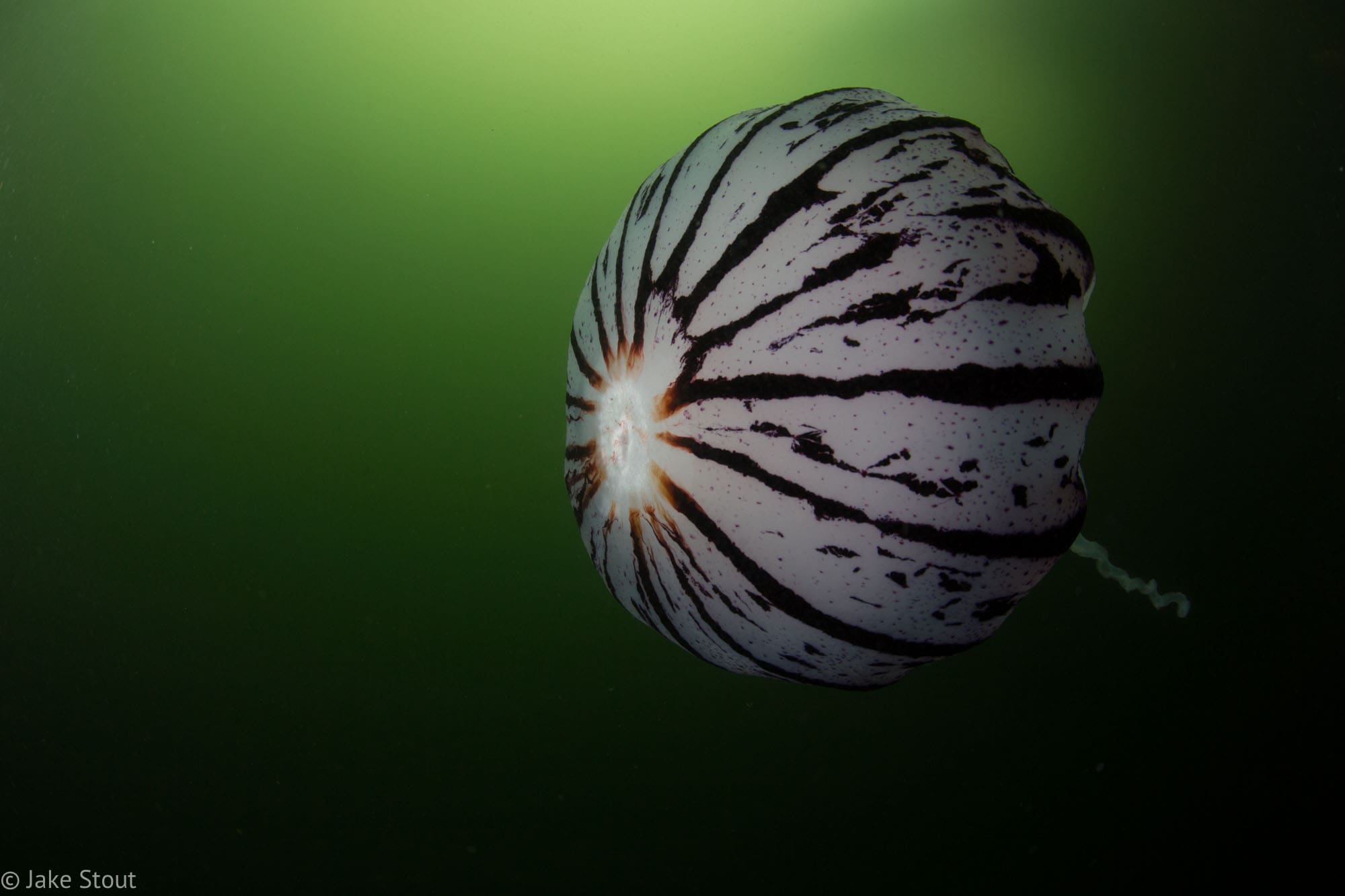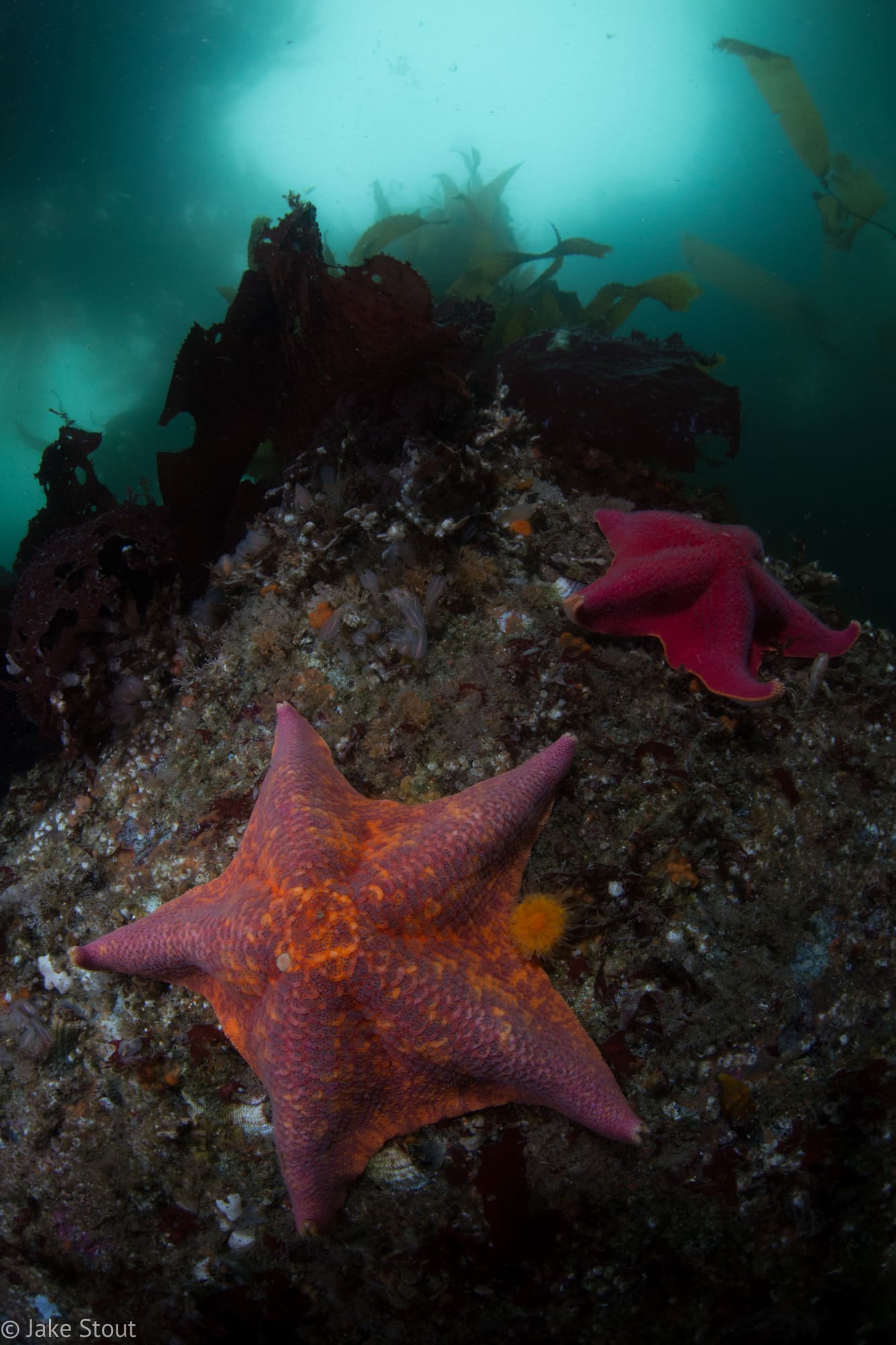I started out by going along the wall looking at all the scarlet psoluses, bat stars, and anemones. The wall is pretty easy to navigate just, follow the rock sand line down and back. The kelp along the wall was really impressive. It reached the surface then spread out along it. I thought it would be really hard to navigate through all the kelp and that I would get tangled up a lot but it was easy to swim through and around. I would photograph the different crabs and fish swimming by me. At one point I was photographing an anemone and realized that there was a pretty big cabazon right next to me. The cabazon is a really well camouflaged fish that has almost a green army camo look to it. I got some shots of it and let it be. Probably my favorite subjects were the anemones that look like something out of Alice in Wonderland. They were massive compared to the anemones here in New England. On one dive I dropped down and noticed a purple striped jelly right in front of me. It was amazingly beautiful with bright colors against the dark green of the sea. I snapped a few shots of it and kept on going.