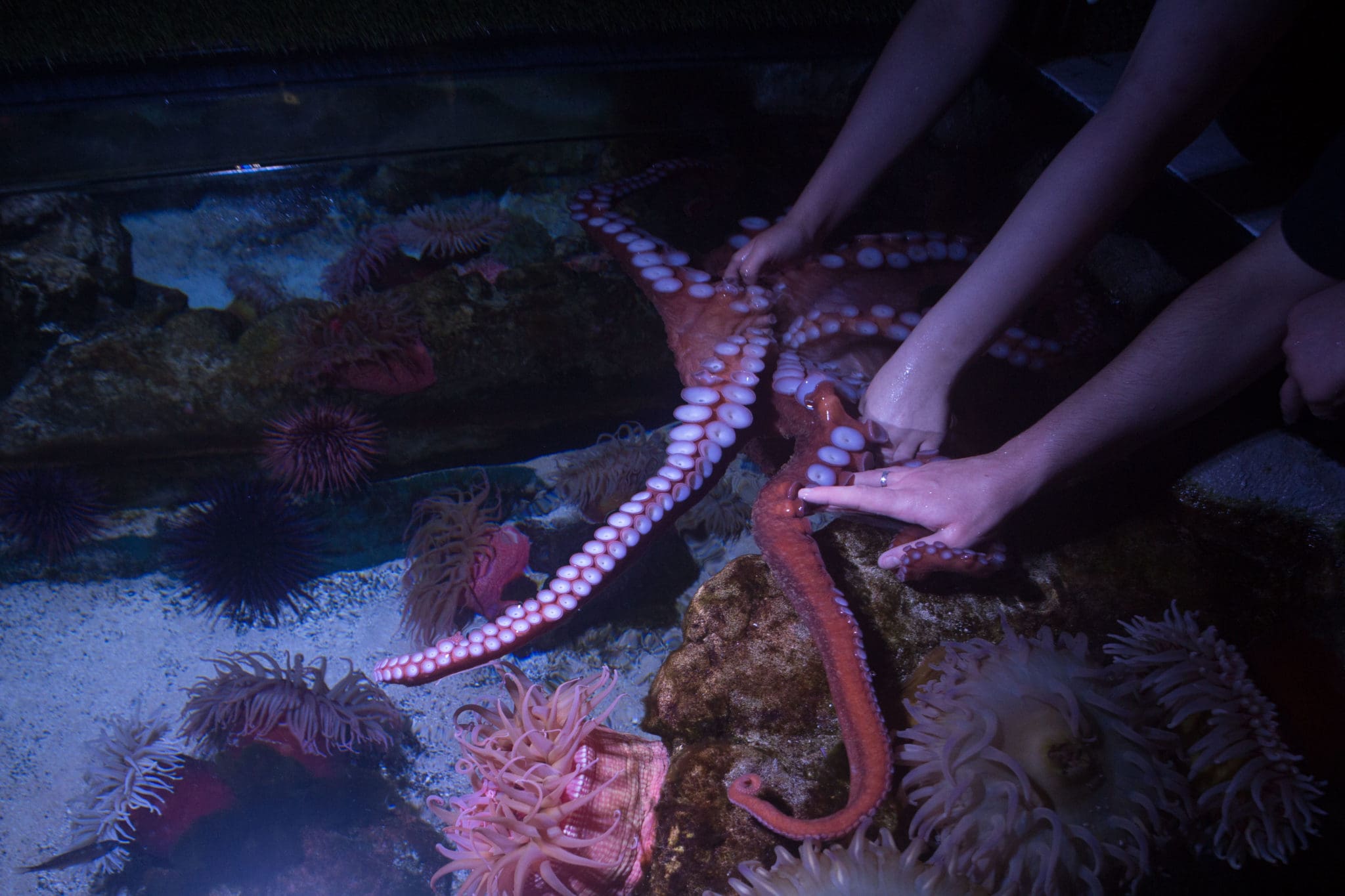 The next department I worked in was the cold water marine department, which houses marine life from Eastport ME, the West Coast, and of course the octopuses. My morning started by helping clean sand for tanks for incoming fish and invertebrates from a recent collecting trip to Eastport. When I wasn’t washing sand I would spend my time playing with the two octopuses. Their names are Freya and The Professor, both have very different personalities. The Professor is a little younger and smaller, while Freya is larger and is right up with the public, The Professor sits behind Freya in another tank. Playing with the both of them it’s hard to not think that they are intelligent creatures. They investigated me by pulling my arms into the tank, I made sure they wouldn’t pull my arms too far, the people watching would be pretty freaked out to see an octopus pulling a human arm into its tank. It was amazing to feel each of the suckers working independently pulling and tasting at different strengths while the octopus changes color and texture. At one point Freya began to pull my hand towards her beak and that would really hurt so I pulled my hand back feeling the full muscular power of octopus. Working with Freya and The Professor was a mesmerizing experience that really made me see them on a different otherworldly level, it was truly amazing.