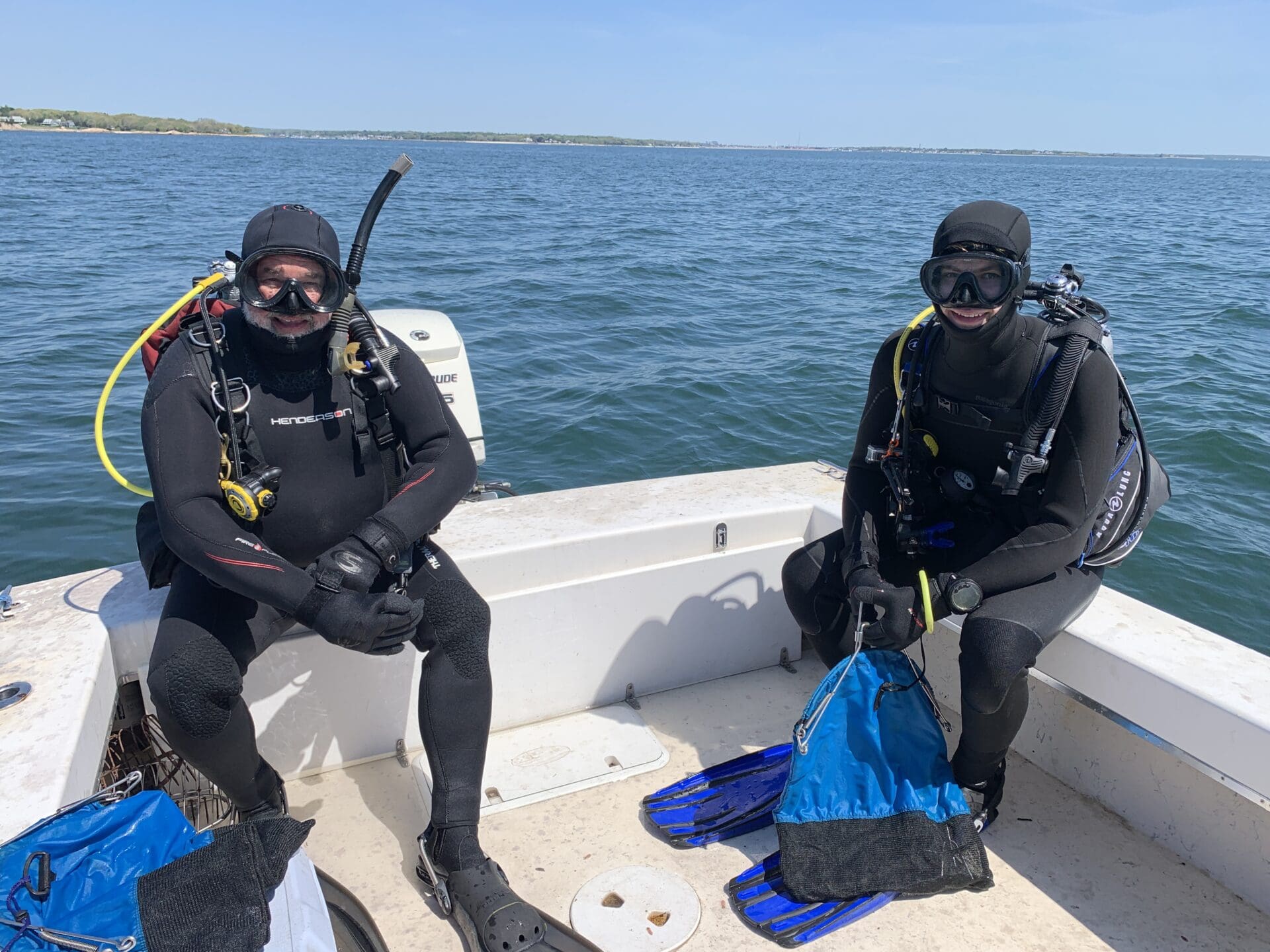 Both mornings we headed out on a DMF boat and did 5 dives, exploring the sea bottom with small rakes and a collecting bag, searching for quahogs. At some locations it was quite easy and we were in and out of the dive site in only minutes, but a couple took quite a while as we sifted through the muddy bottom for over half an hour to find the elusive molluscs. Most of these dives were quite shallow and fairly close to shore, one so much so that we didn’t even dive, opting to stay on top of the water and use long rakes with built-in collecting baskets to help us dig up quahogs hidden deep in the mud. All in all, it was a great time, and I loved exploring the sea bottom with Vin.