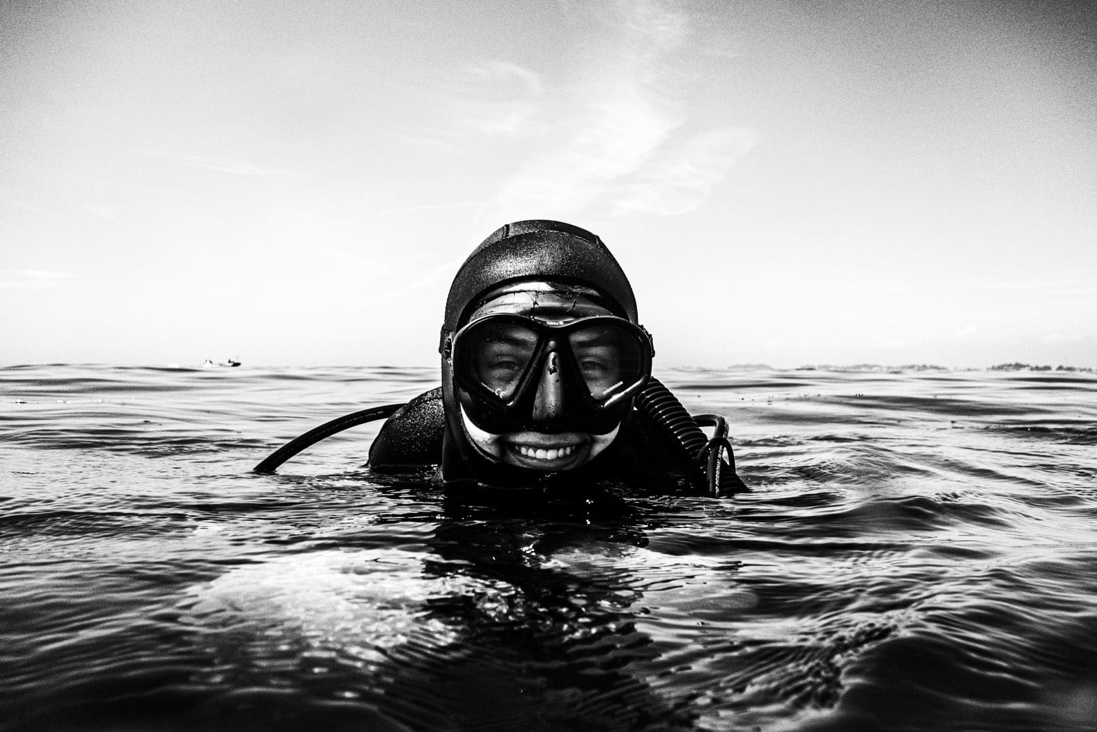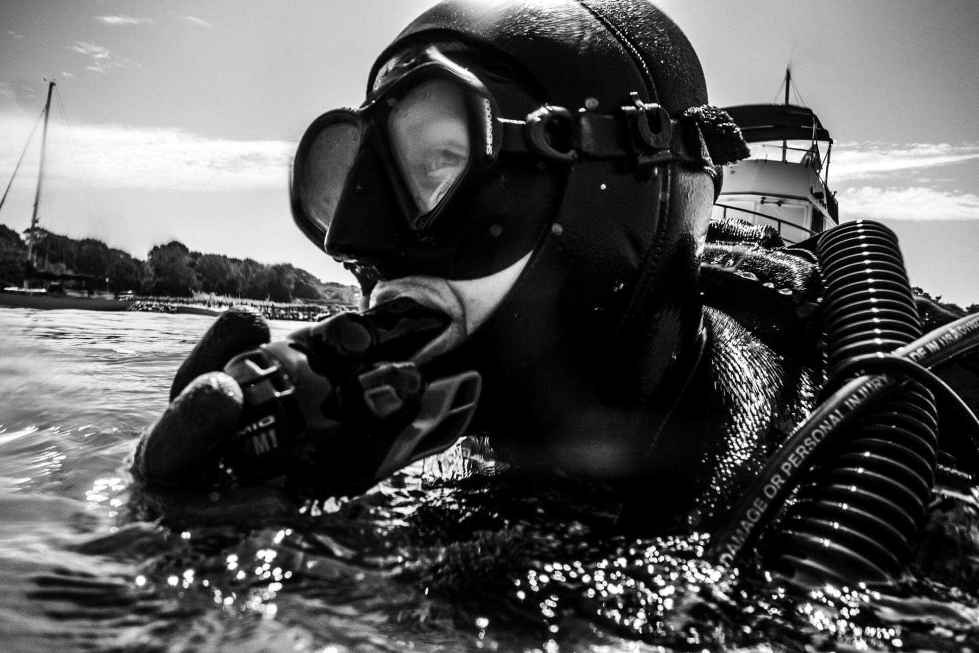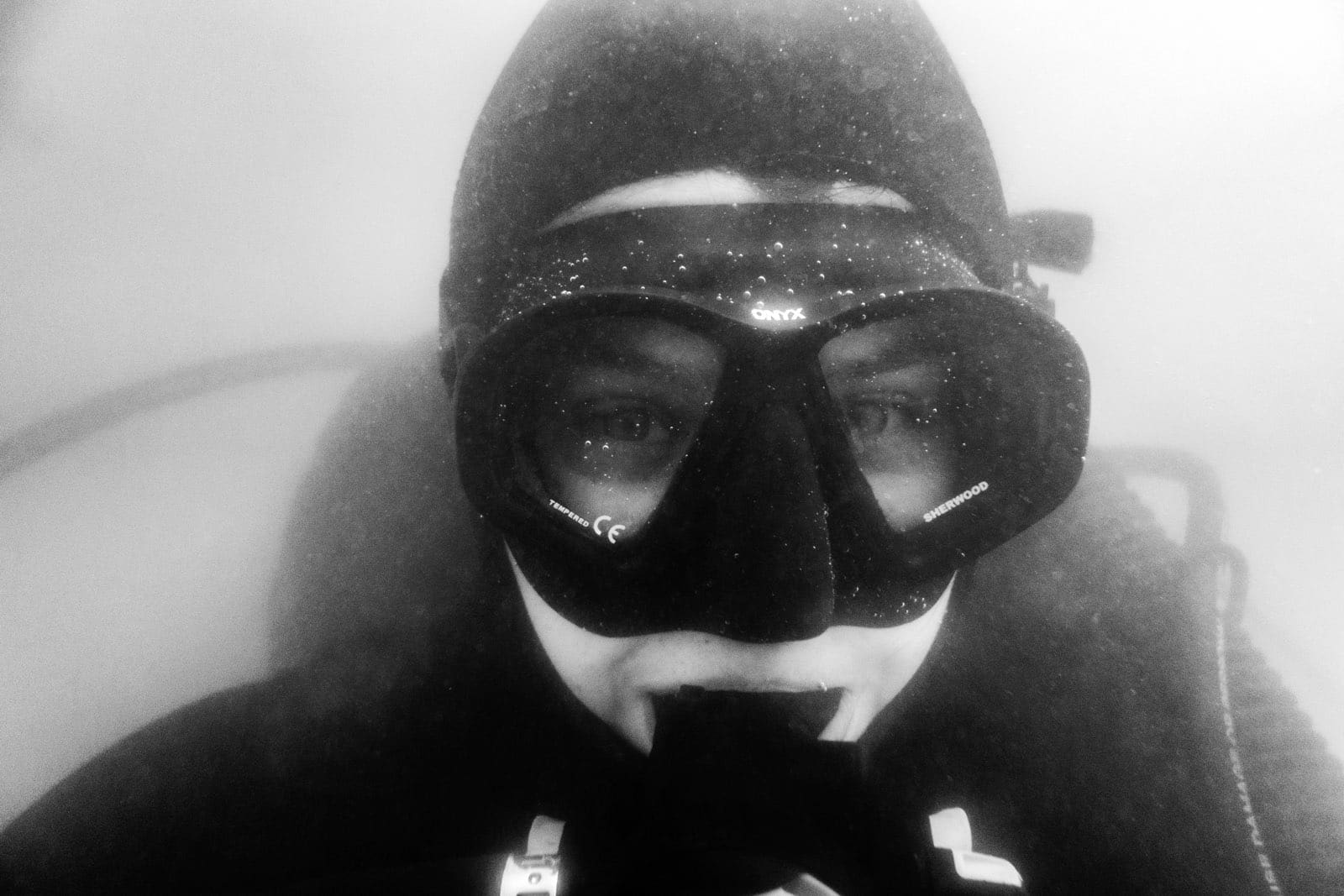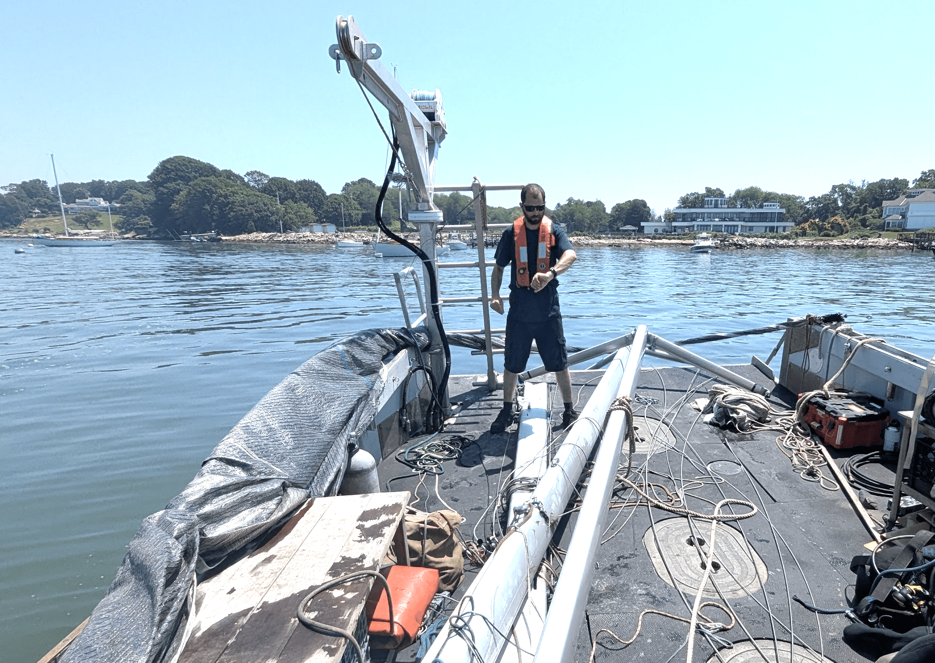 The harbor where the mast had broken off was about a four hour boat ride away from the dock in Noank, so by the time me, Rick, and Rick’s longtime friend and colleague Bobby got there it was late morning. We found the boat in question and met up with Rick’s colleagues Mike and Austin, who joined us before Austin dove down to try and locate the mast itself. Once he found it, we handed down some lines to him which he tied to different sections of the mast. I was geared up at that point, so I hopped in the water with him and we both descended with the lift bags. Visibility was only one or two feet, so we had to descend right on the line and then feel our way along the mast until we got to the section we were going to secure the first lift bag to. We tied them both off, one on either end of the mast, and then filled them one at a time with the inflator hose I had brought down from the boat. Back at the surface, we hooked the lines up to the Integrity’s pulley arms and hauled the mast up. It had been hard to tell how long it was when we were underwater, so I was surprised to see it extended probably ten feet past the stern of the boat!