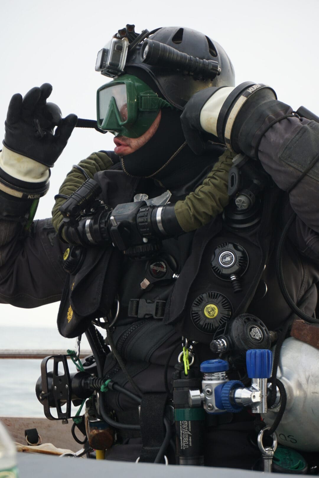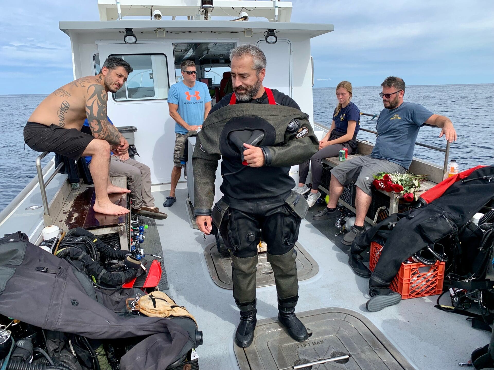 It was super interesting to see them get geared up, as they have so much extra protection and tanks that were backup in case their rebreather had any issues. Once the first group came up from their dive, Joe Maz went down. Since the group was only doing one dive on this wreck (the Texel), Joe Maz was in charge of making sure the anchor was free. The dive went smoothly and they told me about everything that was down there. The last time Rick had dove this wreck, one of his close friends died and he had to recover the body so it was hard for him to do this wreck. Rick and Joe Maz said some words in memory and floated a bouquet of roses for him over the wreck.