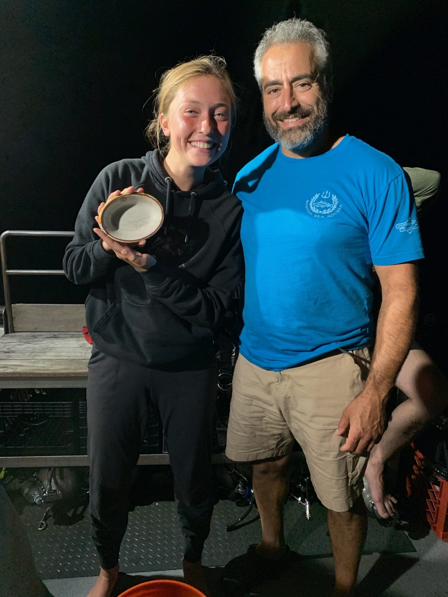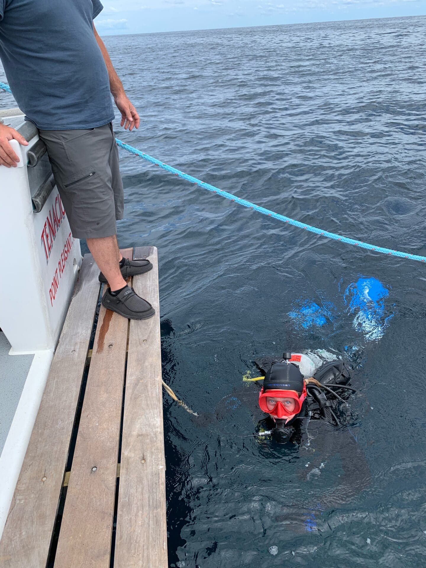 They geared up the same way, and Tattoo Steve secured the anchor again. It was such a beautiful day. They gave me permission to hold on to the rope that they use for decompression and go down to about 30 feet. I was excited because I could see a ton of jellyfish in the water. The current was super strong, so I made sure I was holding onto the rope tightly. I stayed for about 15 minutes, then surfaced, because I didn’t want to get in the way of the first group’s decompression. With the current and the jellyfish, it felt like I was in a snowstorm. The water was wicked warm too, an unreal experience. When everyone else surfaced, they all had brought up different artifacts. Joe Maz had recovered intact china and gifted me a potato bowl. So cool!