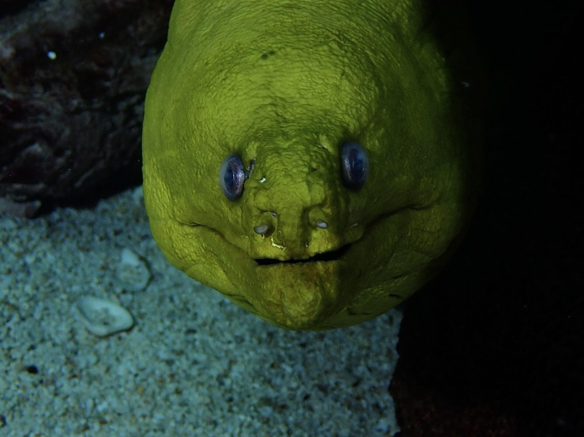 For my first day at the Aquarium, I got to do two dives in their Atlantic Coral Reef tank! The tank is a large ring that allows guests to walk up and down within the tank, providing a super dynamic environment for guests, as well as a fun diving experience. For our first dive, Holly and I had some quick work to do inside, taking quick measurements of the tanks structure for an upcoming project. For this task, wrist slates came in handy so that we did not have to memorize measurements and not have any excess gear dangling for the animals inside to become interested in. After our tasks were done, we got to swim around though some of the exhibits swim-throughs, and then practice a few fundamental skills to ensure safety when swimming in the exhibits. It was super cool to see all of the animals in the exhibit, especially their reef shark named Sophie, and a green moray names Floyd!