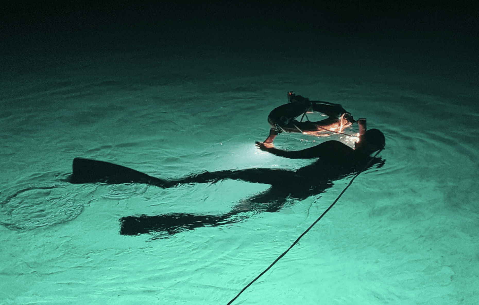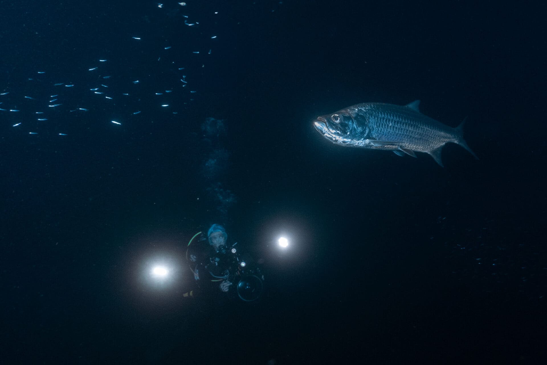 Eventually the lights of the fake moon ran out of battery, but with our video lights on we could still see the hunting tarpon. The bait fish would stay in the light too, so wherever we were was where the tarpon would come to. It was mind-blowing, and we stayed in the water with them as long as we possibly could, until our cameras and lights died at around the two-hour mark.