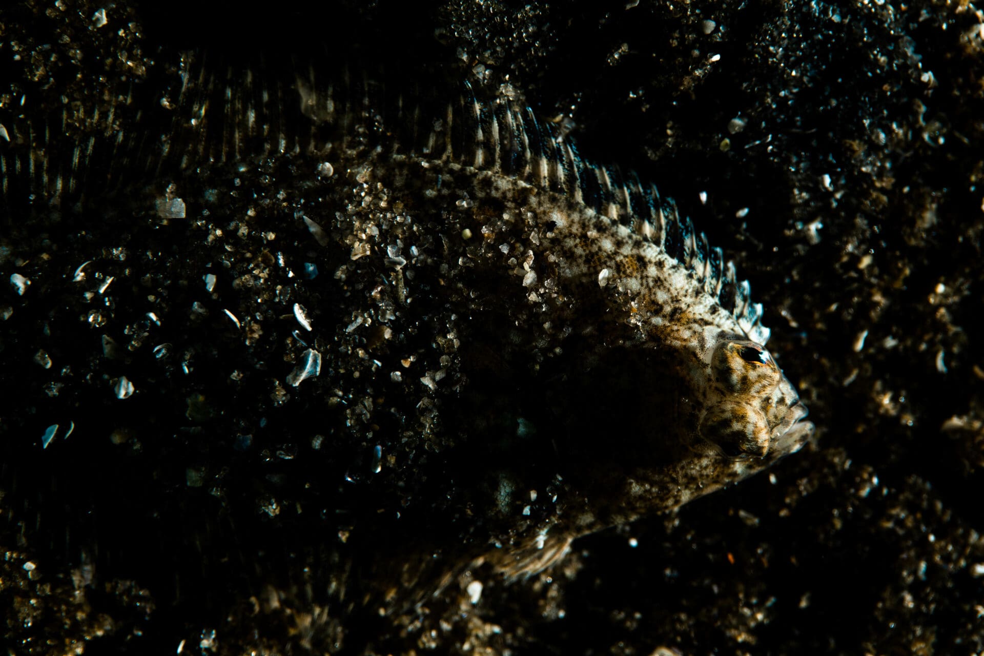 During our surface interval, Jake and I discussed a lot about underwater photography, and planned out some shots for my next dive. He suggested I try and accentuate the ability of the flounder to hide in the sand. Soon on the second dive, I found a baby flounder that gave me just the opportunity. I got a shot I was really happy with, showing the amazing ability of the flounder to hide itself, with a stark side-lighting providing some contrast to still accentuate the flounder against the background. For this dive we stuck to the right side of the cove which was incredibly rich, full of dozens of flounder and lots of crustaceans. It was a fitting end to an amazing summer, and a great learning experience as I continue to work on my underwater photography.