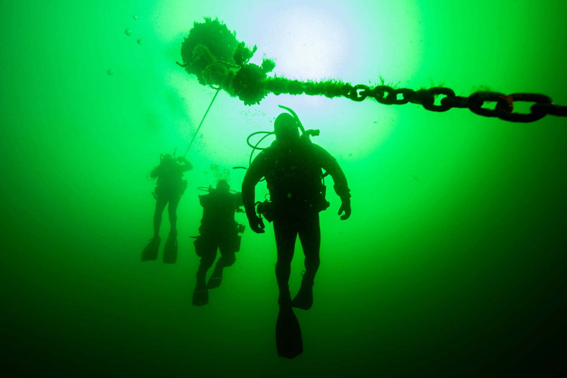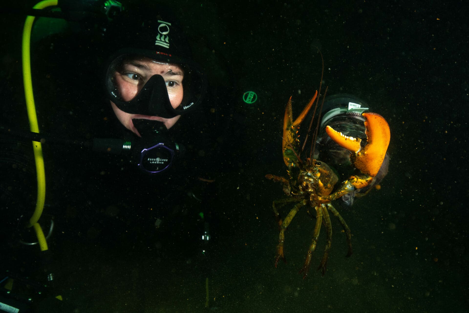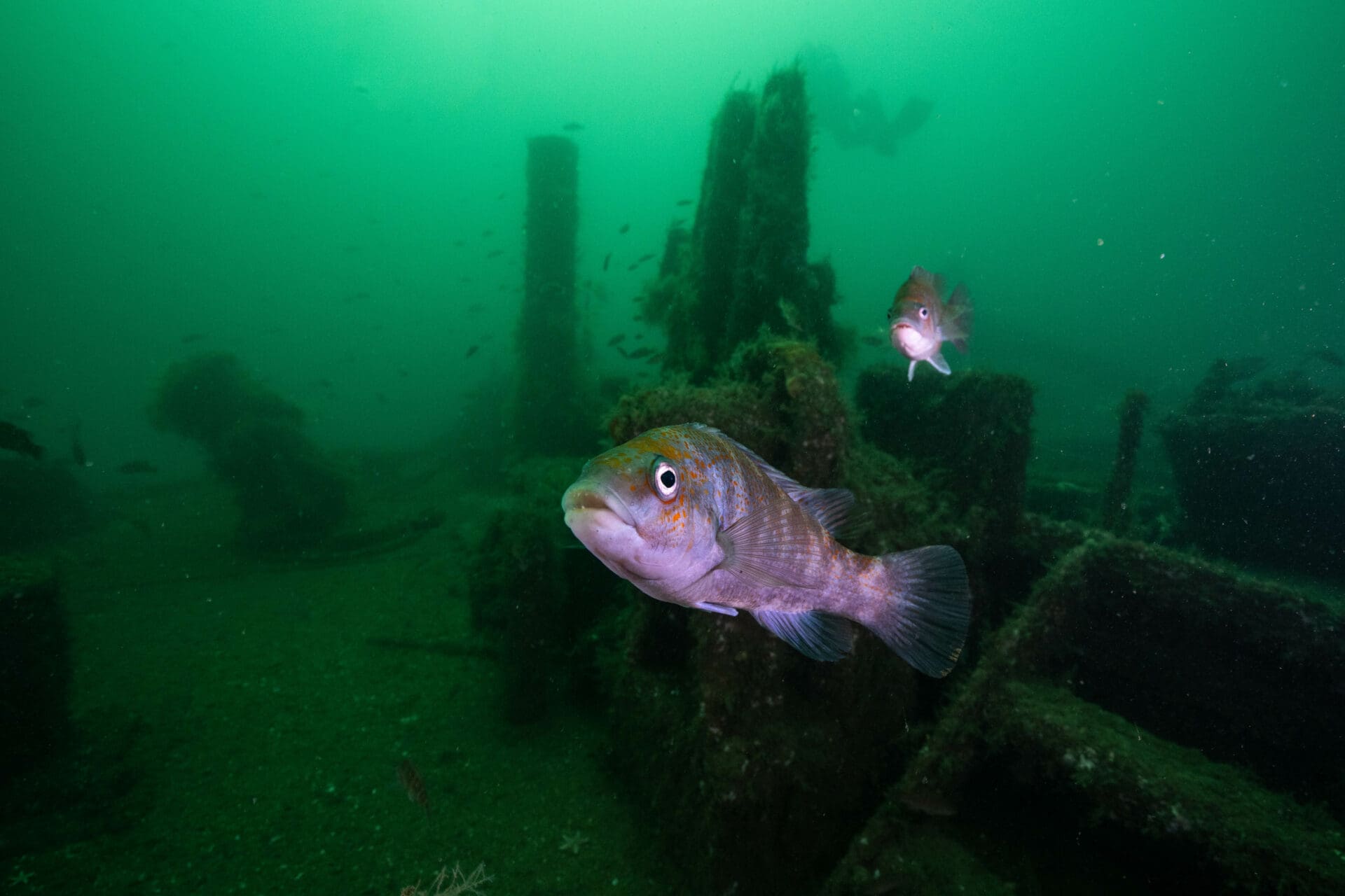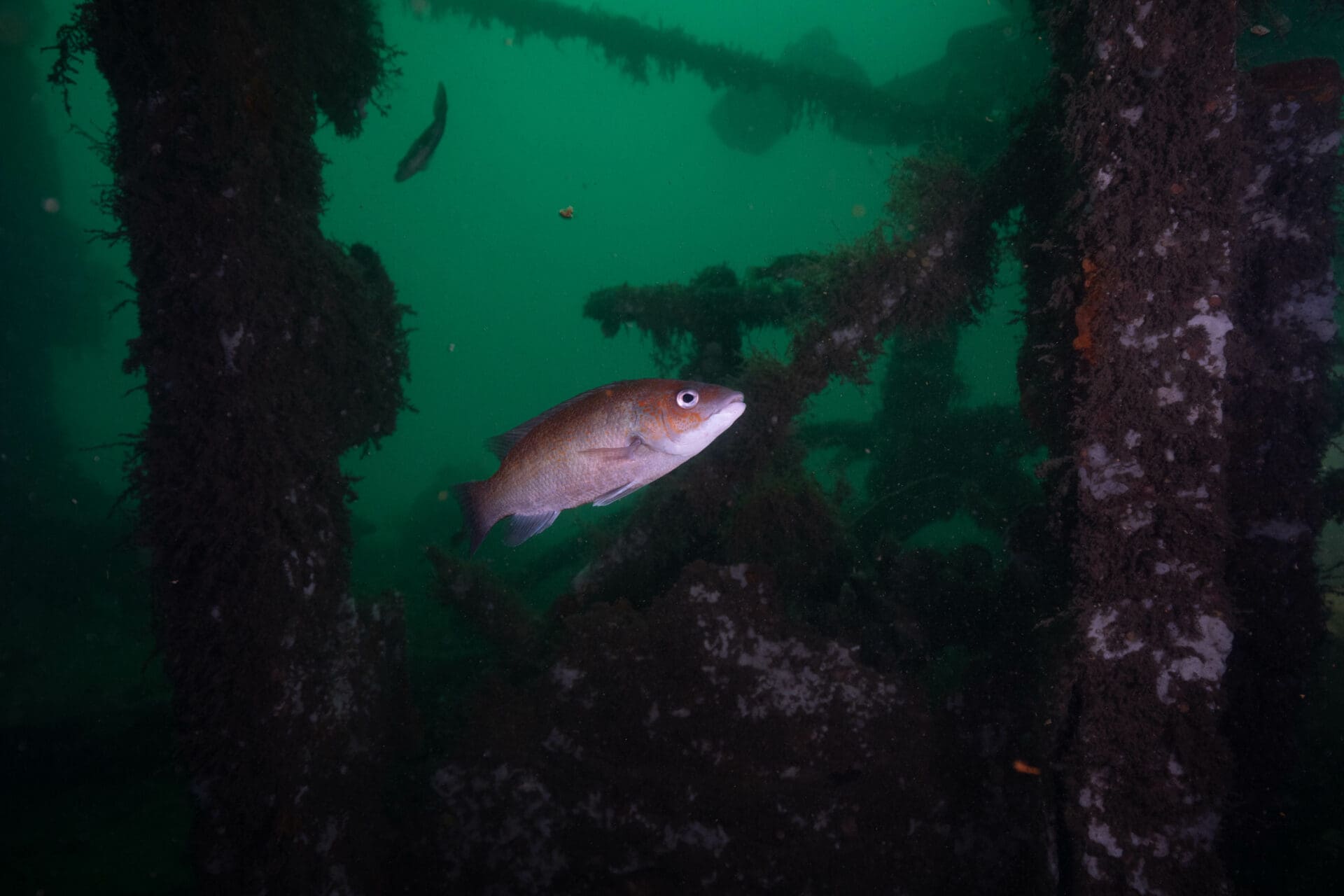 Once in the water, we followed the mooring line down into the depths of the ocean until out the gloom, a shipwreck emerged at about 70 feet. We descended on the stern, and slowly swam along the level top deck until we reached the break. There, we descended once again to about 90 feet, and were able to use our lights to look into the belly of the ship’s cargo hold. Unfortunately, at depth we didn’t have too much bottom time, so we soon turned around and made our way back. Luckily, I was able to bring my big underwater camera I have on loan from backscatter with me on the dive and capture the rich life that the wreck supports. While absent of the corals that dominate tropical wrecks, the Chester Poling houses many fish, lobsters, and sponges.