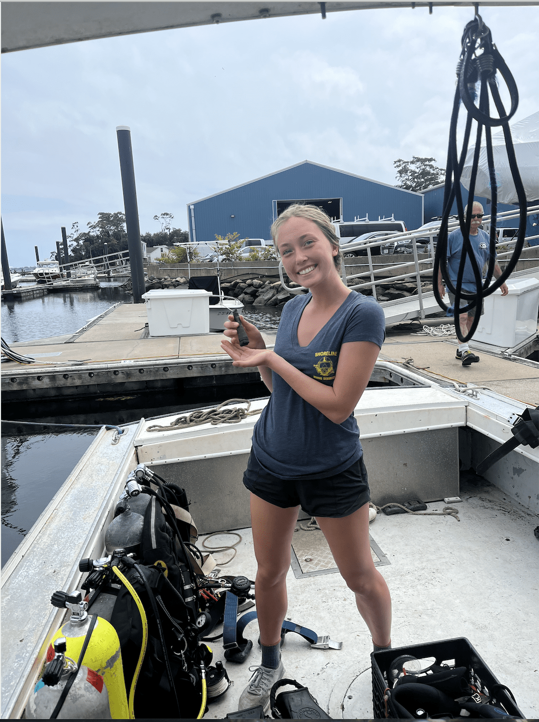 Nobody died in this wreck. The Onondaga ran aground on the reef, and all its crew were able to evacuate before the ship went down, but it took all its cargo with it. We kept searching until we reached the end of our dive and used the same mooring line to surface. Eric helped us out of the water and we headed to the next dive site. This was going to be the wreck of the Atlantic. The wind had picked up quite a bit though so it was hard to get our anchor to stay in one place. Rick and I got suited up and went to the anchor line and descended. Rick moved the anchor into a place where it would hold well for us, and then we tied off our reel and headed to the wreck. It was a little swim away since we couldn’t get the anchor to stay. As we were swimming there, the reel came to the end of its line, which is 185 feet of line. We had decided to use the reel for navigation, so we couldn’t go farther than it would reach, so we didn’t make it to the wreck. We explored the substrate and saw a lot of starfish and looked for lobsters underneath rocks. We headed back to the boat by reeling the reel in and using the anchor line to surface the same way we did on the previous dive.