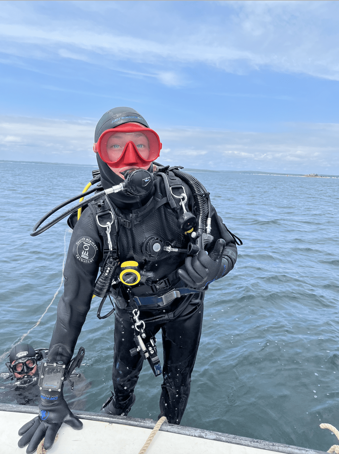 Rick and I drove to his boat this morning and met up with his father, Eric. Today we will be diving two wrecks! The original plan was to head to the wreck of the Volund but since itwas pretty overcast and the wind was supposed to pick up, we decided the wreck of the Onondaga in Watch Hill Rhode Island was a better decision. This wreck is in about 50 feet of water, and usually has better visibility. Rick and Eric had put a mooring off of the Onondaga so that it was easier to find this season. When we got to the mooring above the wreck, we waited a little bit until the tide was closer to switching and becoming slack as it would be an easier dive for me. I haven’t dove a wreck in New England, so I was very excited! Eric went down first for about a 30 minute dive. Before he surfaced, Rick and I got into our drysuits and were ready to go so that once Eric was on the surface we could hop right in. The current was still moving pretty strong at this point (or at least strong compared to what I have dove in before). We back rolled off the side of the boat while holding a rope so we didn’t float away, and then transferred over to another line that was hanging from the stern to the bow of the boat so we could safely make our way down the mooring line. We descended holding on to the mooring line since the current was strong and we would have had trouble finding the wreck if we had just descended with no guidance. The mooring was attached to the boiler of the ship. I tied off a reel to the end of the mooring and Rick tied off a flashing light. This light was for safety. If we were to get separated, and couldn’t find each other after a minute of searching, we would head back to the mooring line and surface. If the light is there, you take it with you, so that if your buddy comes to the anchor line they know you have surfaced. It is just another form of safety and communication underwater.