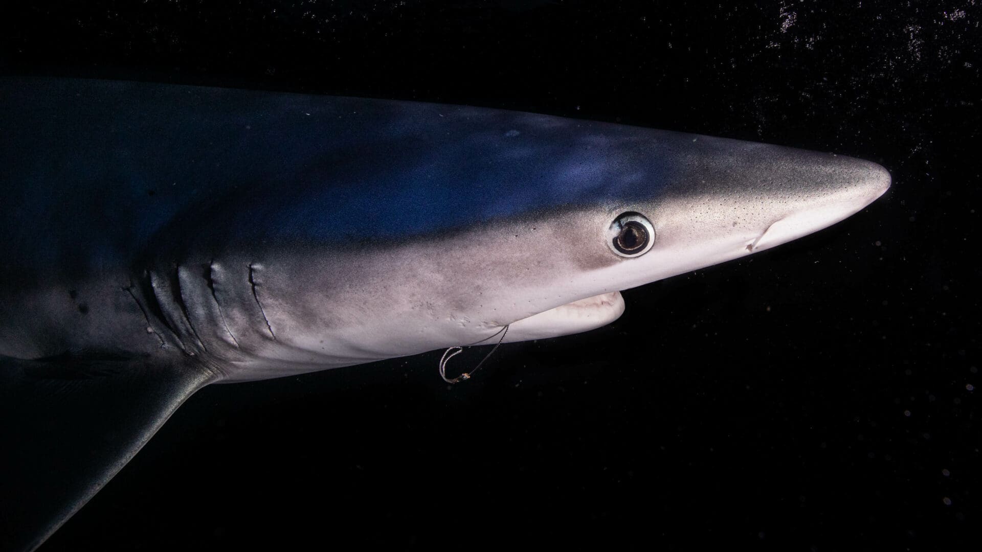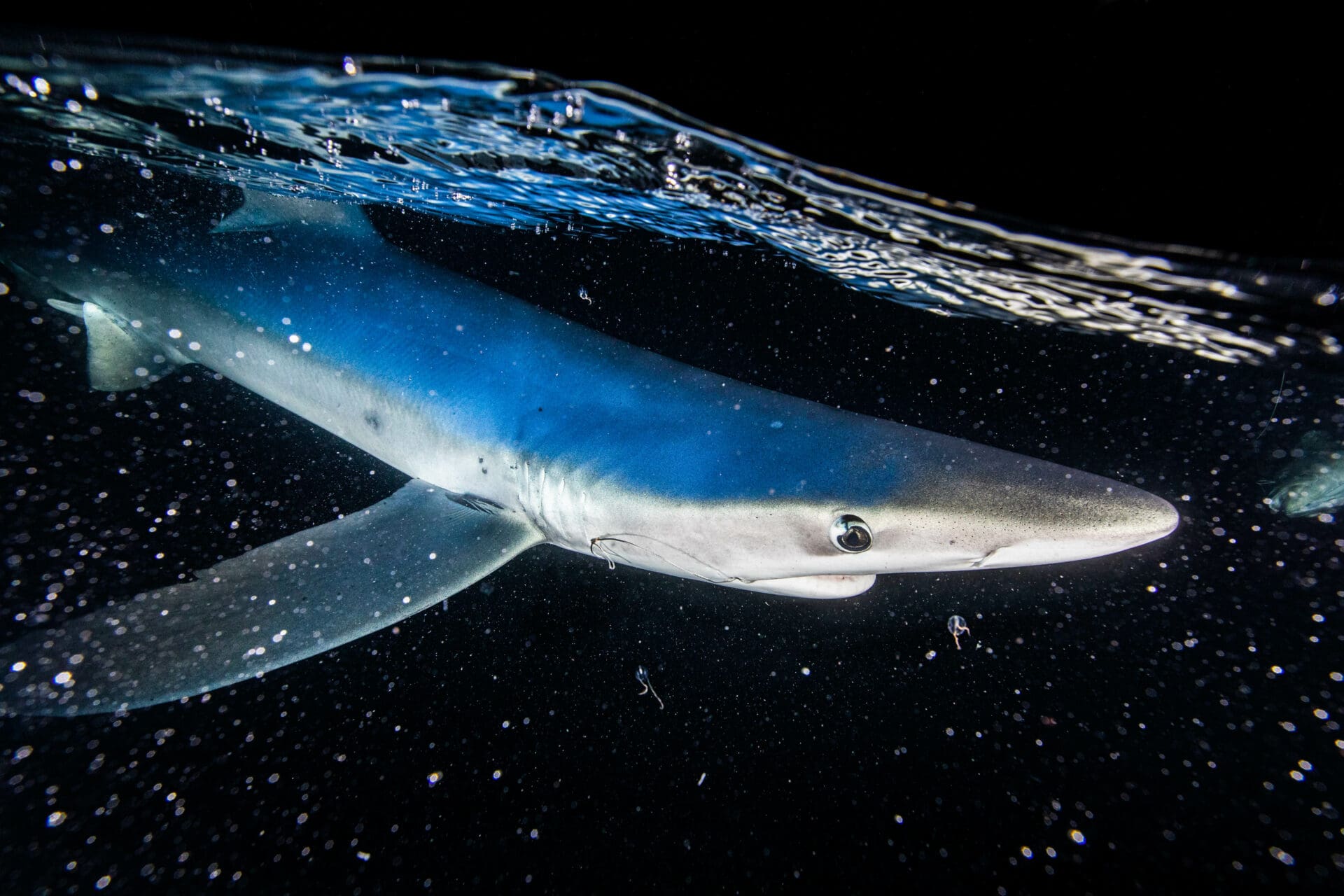Once the sun set, a large 8 foot mako shark showed up alongside the boat, and we started to really get into the filming. Lauren took her turn first, laying with her underwater camera hanging off the side of the boat in the water and filming the shark as it swam by. After about half an hour of filming and a few close calls with the shark, Lauren was finished and I got to take my turn. Luckily, the big mako had already left and an 8 foot blue shark had taken its place. Blue sharks aren’t quite as fast as makos and are a lot less powerful, so I was happy to get my first chance at shark photography with the more manageable species. To photograph the shark, I copied Lauren, lying with my arms hanging down into the water, and holding an underwater camera fully submerged beneath the sea surface. The blue shark was sleek and beautiful, illuminated by flood lights pointing into the water off the side of the boat. As it came near, boat captain and shark wrangler Mitch threw a large piece of fish on a long line into the water. The shark spotted it and quickly chased it as Mitch drew it in, right towards my waiting camera. When the bait was a few feet in front of me, Mitch pulled the bait out of the water and the shark turned right in front of the camera as I panned to make sure the shark couldn’t get between the housing and the boat. I got soaked by the waves for the next 45 minutes and struggled to hold my heavy camera as the sharks darted towards me. After I was finished, my heart was racing for the next couple hours, the adrenaline rush of filming the massive sharks not wearing off until 3am.