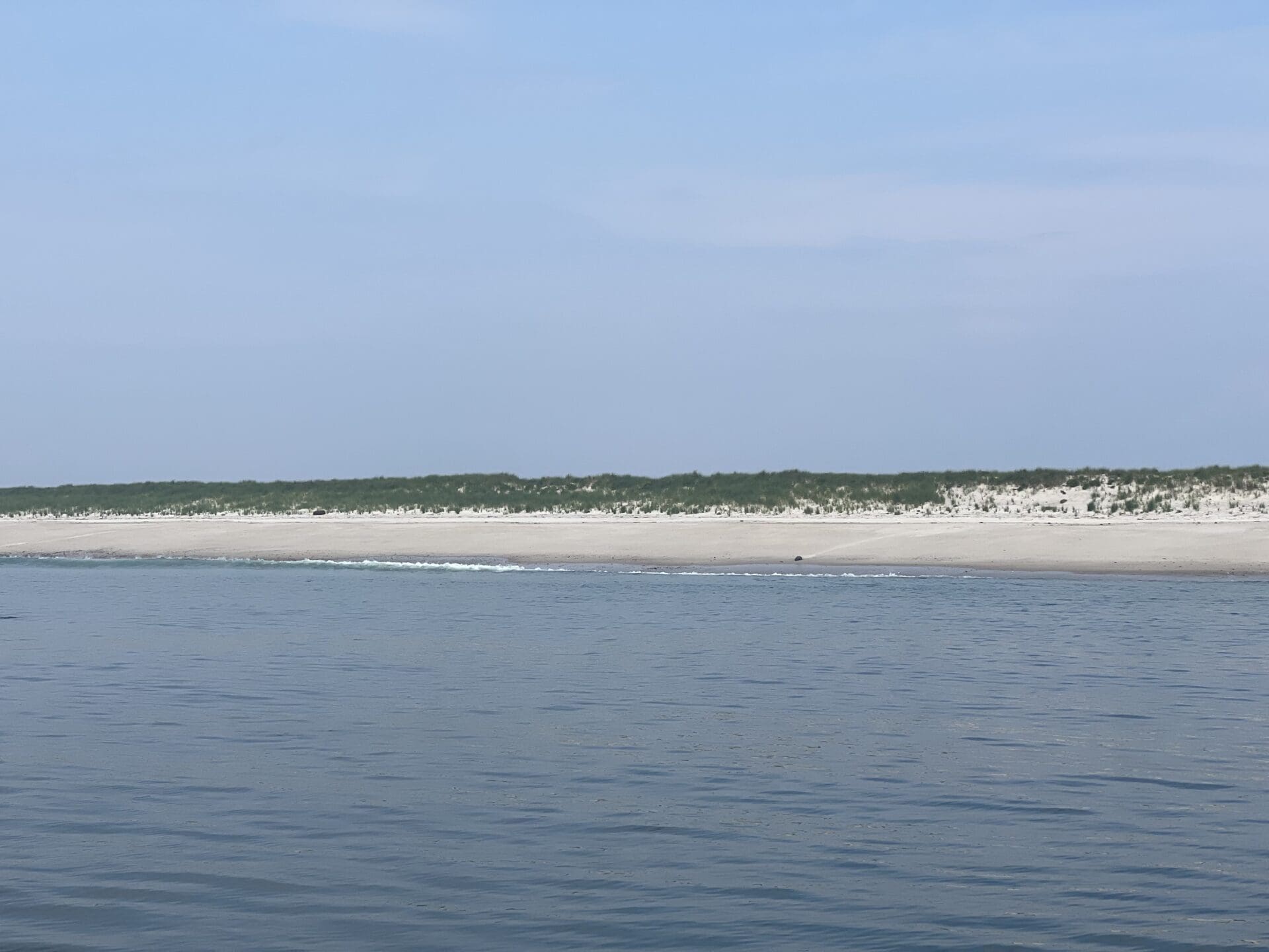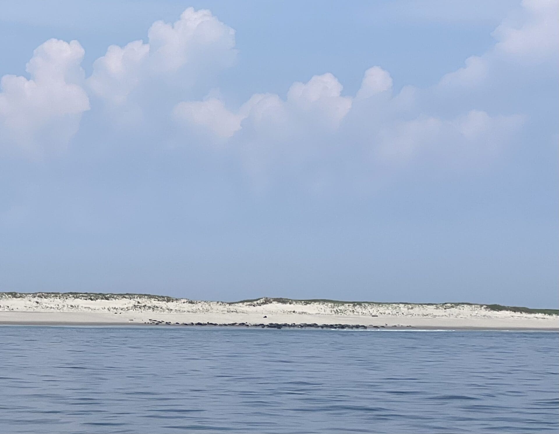 The next day Vin and I met at the marina again, but today I got to join him and Dr. Greg Skomal. Dr. Skomal is a Senior Fisheries Biologist at the Division of Marine Fisheries, and an accomplished explorer photographer and author. Dr. Skomal’ s goal for today was to launch the buoys which we had loaded onto the boat the day before. These buoys are equipped with an acoustic device which receives a signal from acoustically tagged sharks, and later provide data to Dr. Skomal, as well as the Atlantic White Shark Conservancy about shark position and movements! On our way to the coast of Cape Cod, I was able to practice steering the boat, and get used to navigating out on the ocean. Thank you Vin for all of the guidance! While we were under way, we got super lucky and saw a pretty big leatherback sea turtle too! Once we arrived at our first site, we immediately began to see seals by the hundreds along shore.