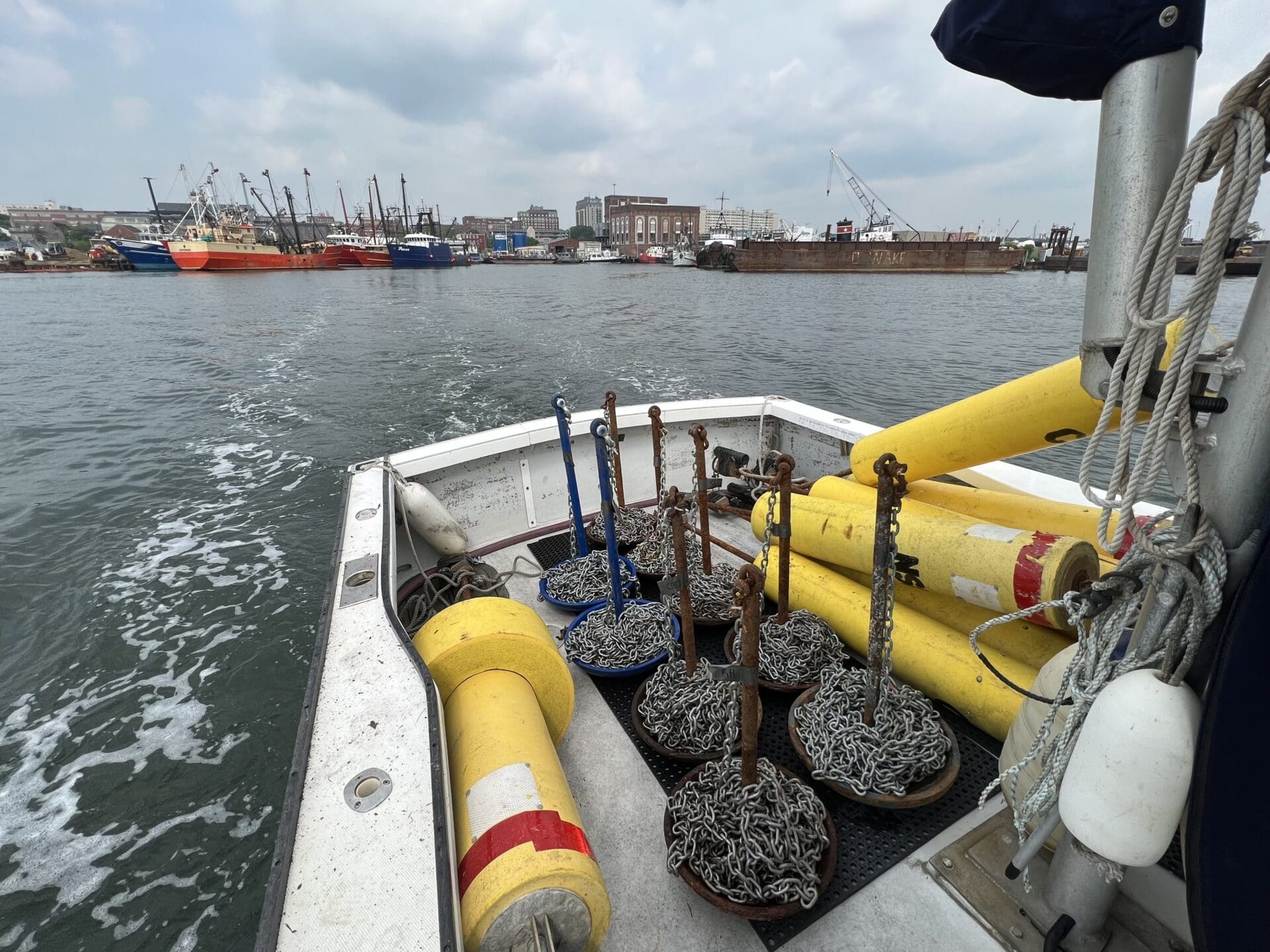 We started to get to work placing buoys, first we would attach the buoy to a mushroom anchor, then make sure the chain was in place to deploy without getting caught or tangled, and finally tossing the anchor into the water. We went through this process multiple times, leaving these buoys along the coast. On our last buoy, it started to rain, so I got to don the foul weather gear, and tossed the last anchor into the water.