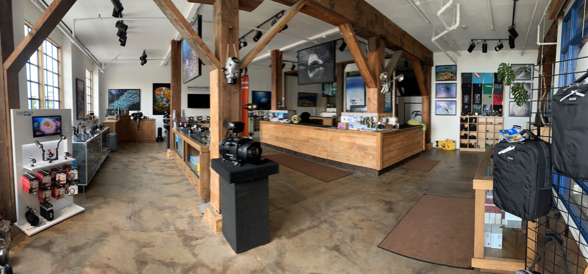 `My trip to Monterey started out like most cross-country trips do, an early morning plane flight lugging my excess baggage across the country. Luckily, my plane flights were uneventful and I landed safely in the quaint Monterey regional airport where Becca from Backscatter picked me up. It was already late into the evening, so she dropped me off at my motel and I got to work setting up my underwater camera. The next morning, Becca picked me up again and took me to the Backscatter shop, beautifully located along the seashore on the historic cannery row.