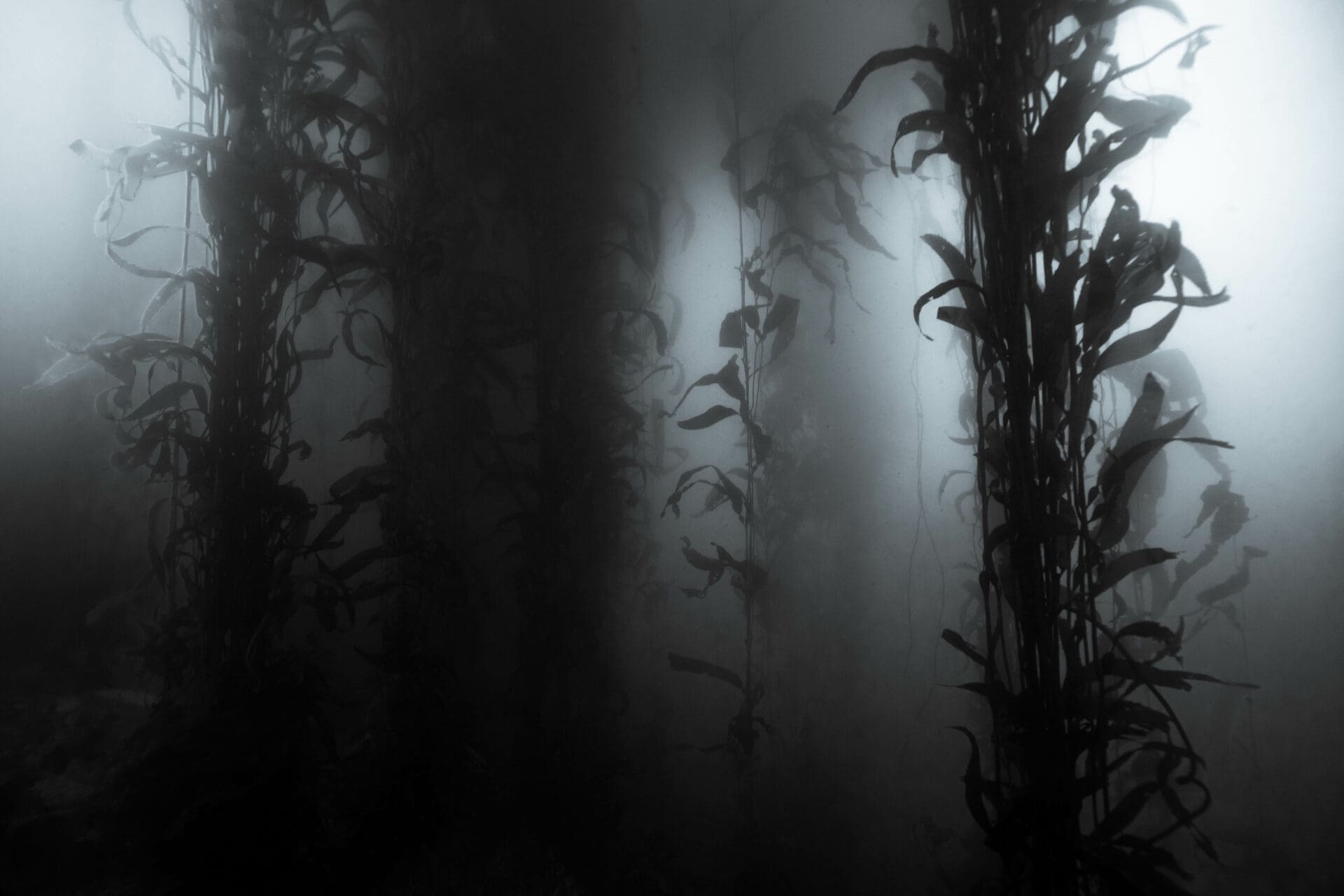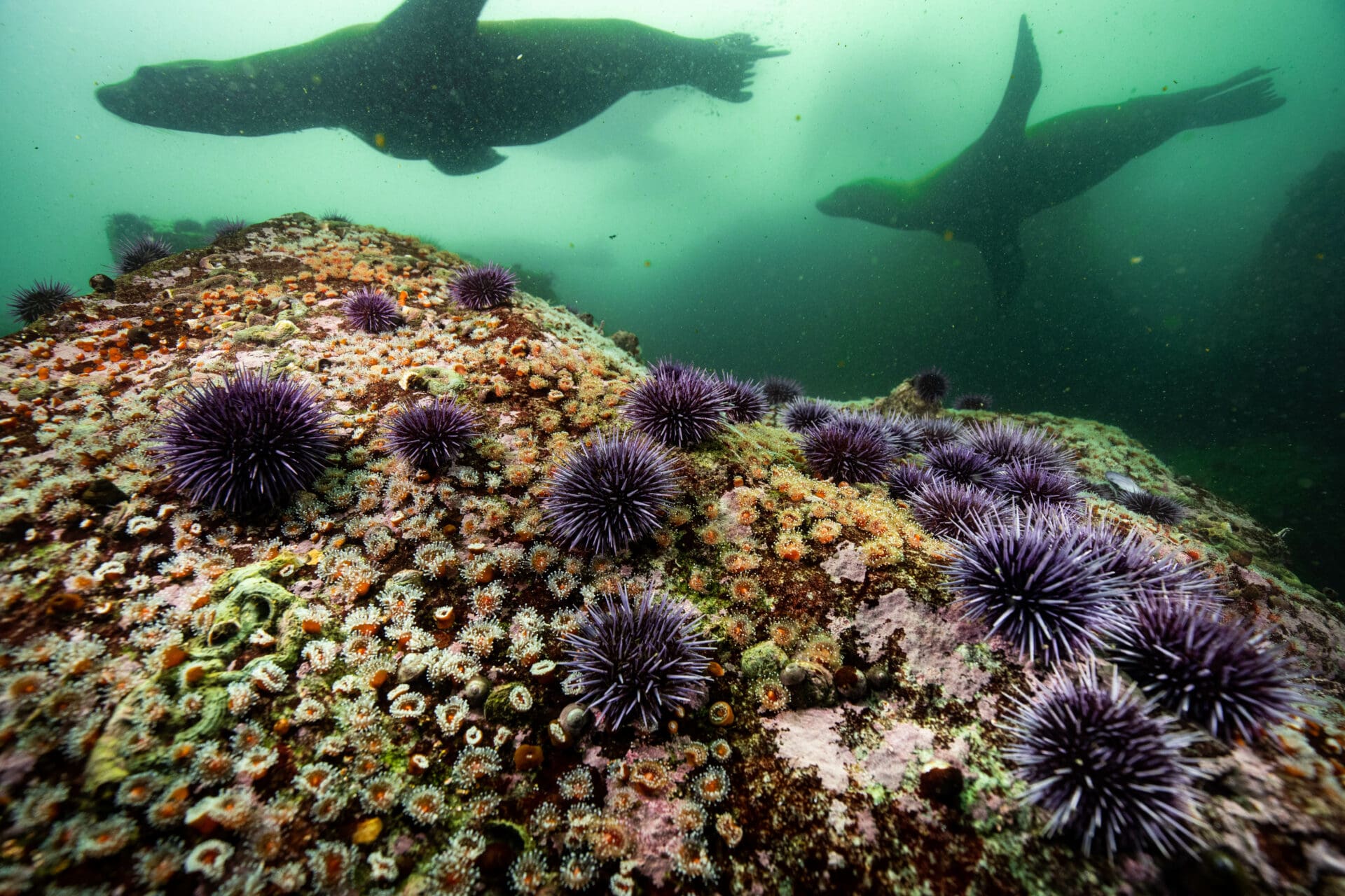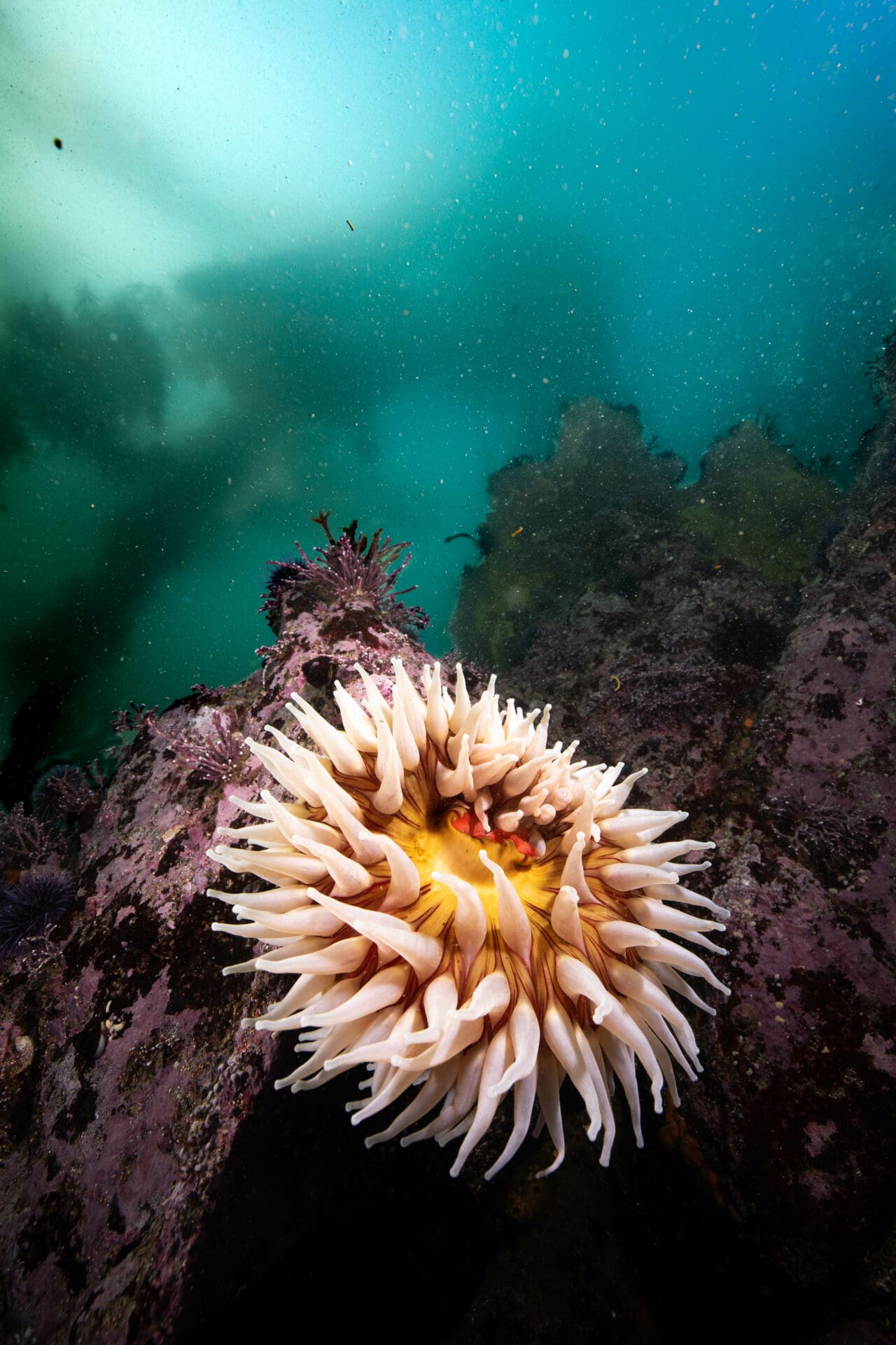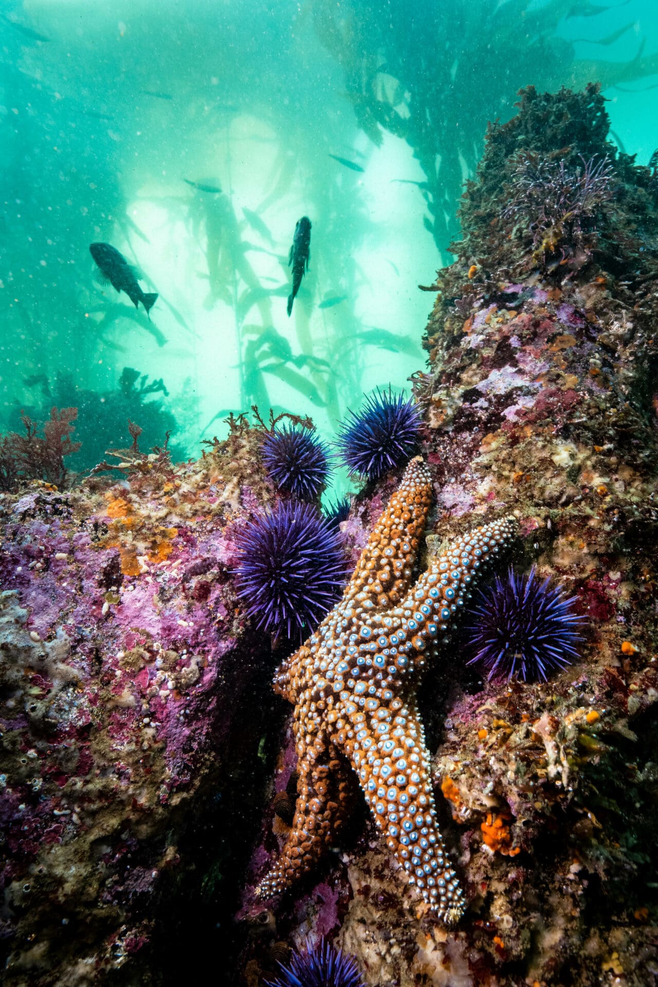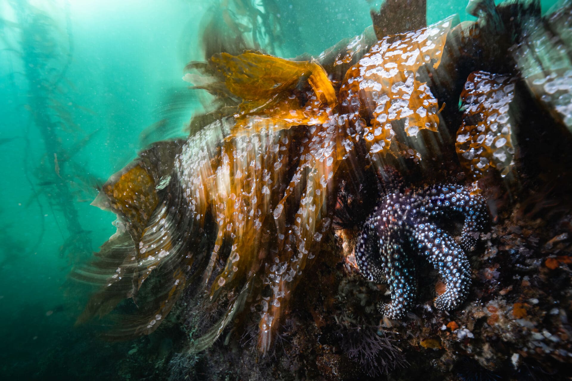 For the second dive of the day, we got to use Berkley’s boat again, traversing along the California coast a mile or two until we found a shallow section with a teeming kelp forest. I focused on my wide-angle photography, getting up close to subjects like big fish-eating anemones, and framing them with the kelp forest behind. About halfway through the dive I also realized that the big swell was making whole bunches of kelp flop back and forth over the rocks. I soon found an ideal location, where a sea star was being routinely covered and uncovered by a whole mat of kelp. This was my moment to work on shooting with a slow shutter speed. I set up and stayed there for at least 10 minutes, taking countless shots to balance the perfect movement in the kelp, while keeping the sea star in focus below.