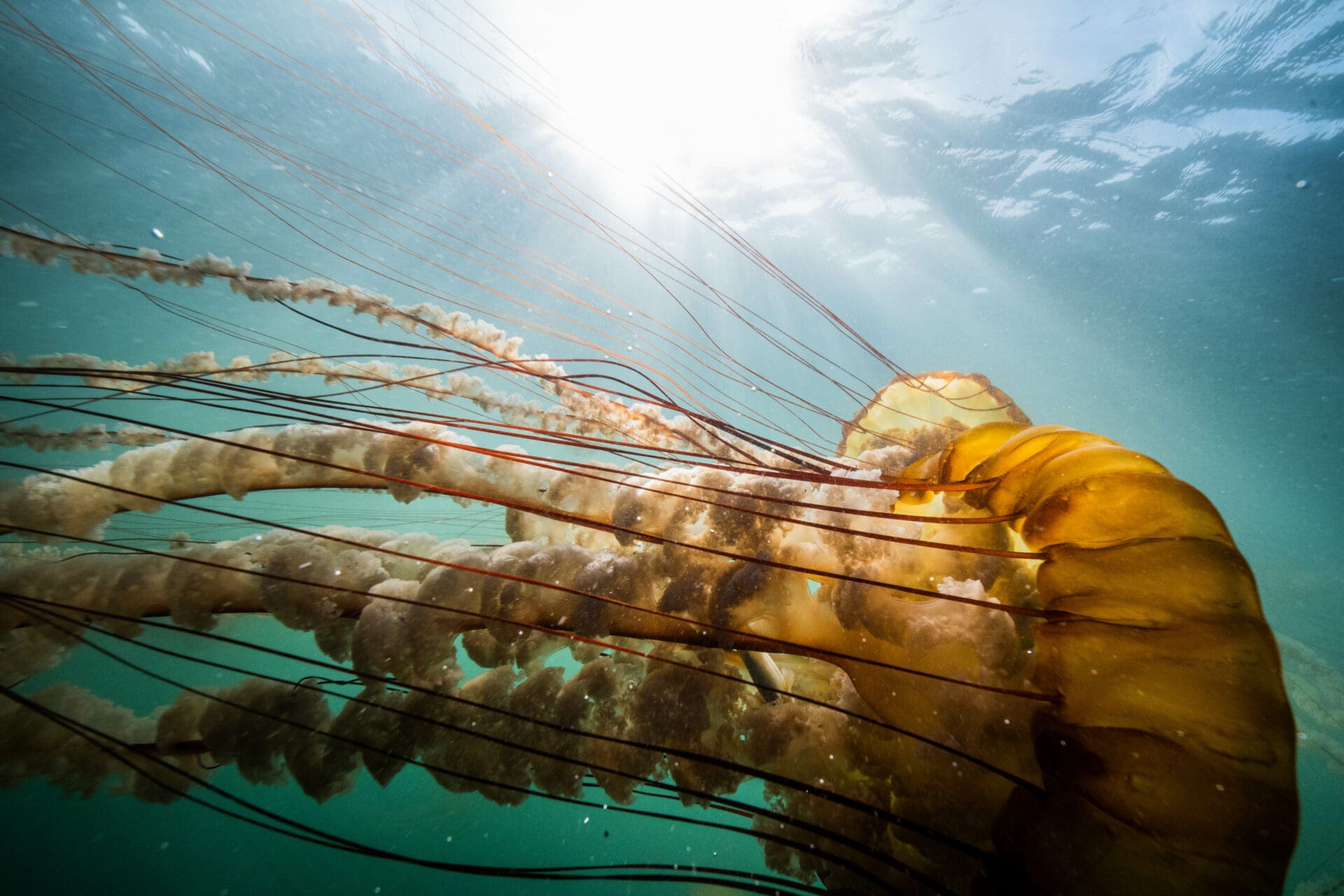 On the way back from our dive, we ran into a teeming swarm of sea nettles, all drifting slowly near the surface. I had my dry suit on with no weight belt, but I jumped in with my camera anyways, flopping around on the surface, trying to get down low enough to get some cool photos.