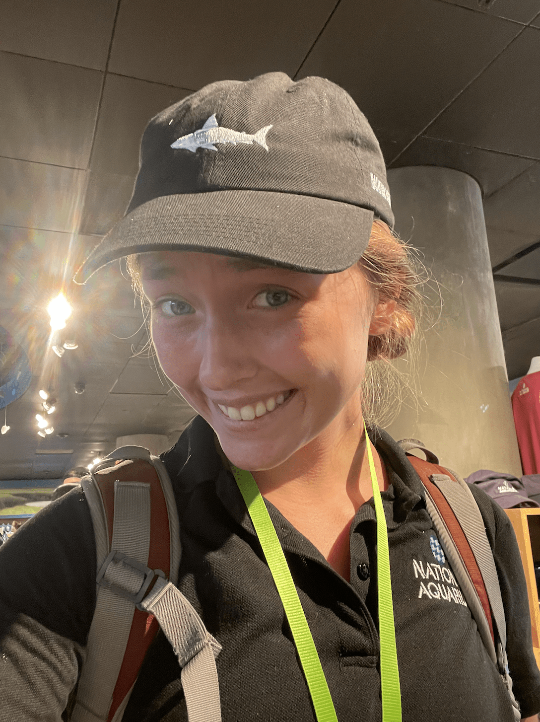 Katie and I fed the two stingray! The stingrays are normally in the Atlantic Coral Reef Habitat at the main aquarium. However, they could only be fed by hand by divers, and during covid there were little to no divers, so they had to be transferred and haven’t been returned. Katie was explaining to me that they are trying to train the sting rays to come to the surface for their food so that they don’t rely on the divers. They are doing this in stages. First they are putting the food in little balls with holes in them that are tied to a rope and belayed to the bottom of the tank. Then, they are starting to introduce the hand feeding tool into the water so they aren’t afraid of it. Then they are slowly raising the balls of food so the stingrays get used to coming up to eat. Then, removing food from the balls but still using them as a cue that food is coming and feeding them with the hand held grabber thing. We were on the stage where the hand held grabber was in the water but food was still in the balls. We actually got the smaller ray, Garfunkel, to eat a piece of fish from the grabber tool, which was the first time she had ever done that! I had a great time at the ACRC!