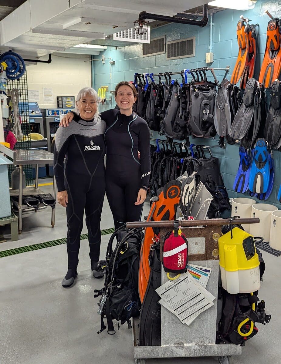 That afternoon I got to see those fish in the ACR when I joined Holly and a new volunteer on his final check-out dive. We did a loop around the tank before they began his remaining skills, and I was able to explore around that area more. I’ve always wanted to dive in an aquarium, and this time I didn’t have any skills to focus on or devote my attention to, so I had the time of my life watching the schools of smallmouth grunts and waving to the little kids on the other side of the glass. Diving at the National Aquarium was truly an exceptional opportunity that I am so so grateful Holly organized for me!