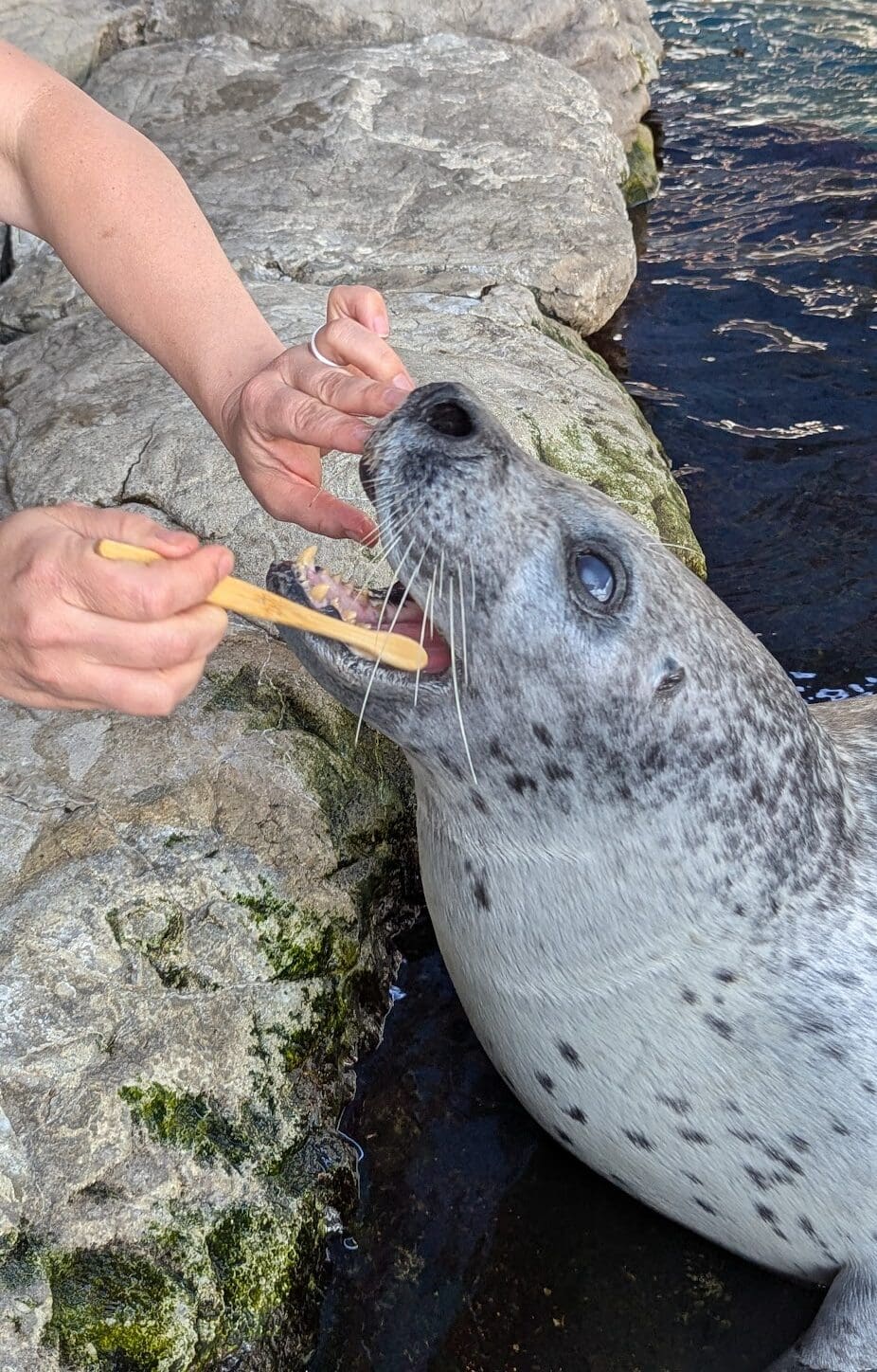 Back in the behind-the-scenes area, Alyssa from AHD was with some of the trainers as they practiced some procedures with Farley. It’s important for the animals to participate in their own healthcare by being familiar with what is asked of them during procedures. Rather than sedating or subduing the pinnipeds, the aquarium trainers positively reinforce the behavior Farley needs for giving blood: laying on his side, flipper out, holding still while people touch and prick him. He did great, and they rewarded him with tons of fish and some jello as a treat.