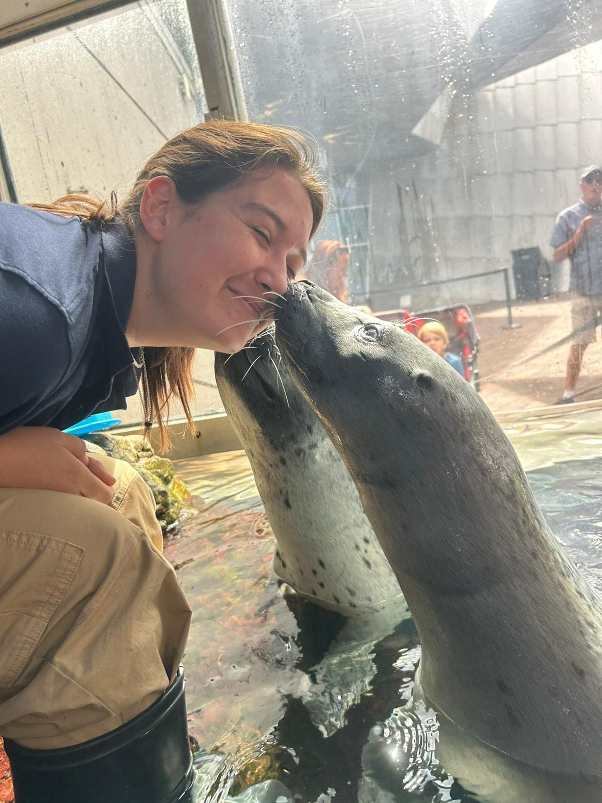 Speaking of the harbor seals, Thursday was my day with the Pinnipeds team!! The New England Aquarium has harbor seals and southern sea lions. In the morning, I helped with food prep, inspecting and cutting the fish and squid for both the seals and sea lions. When that was done, we headed across the aquarium to the seal exhibit (full of water again) for training. I got to walk all the way down the exhibit to sit with trainer Mollie, with Trumpet and Chacoda (a mother and son in the “spotted family,” one of the two harbor seal families). I was really impressed with how extremely well trained they both were! Granted, they’ve had 30-40 years of training from professional animal behaviorists, so it makes sense. They were so well-behaved that Mollie had me feed Trumpet some fish as a reward and got kisses from both the seals!