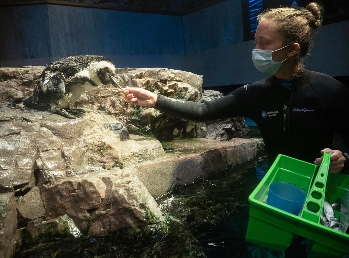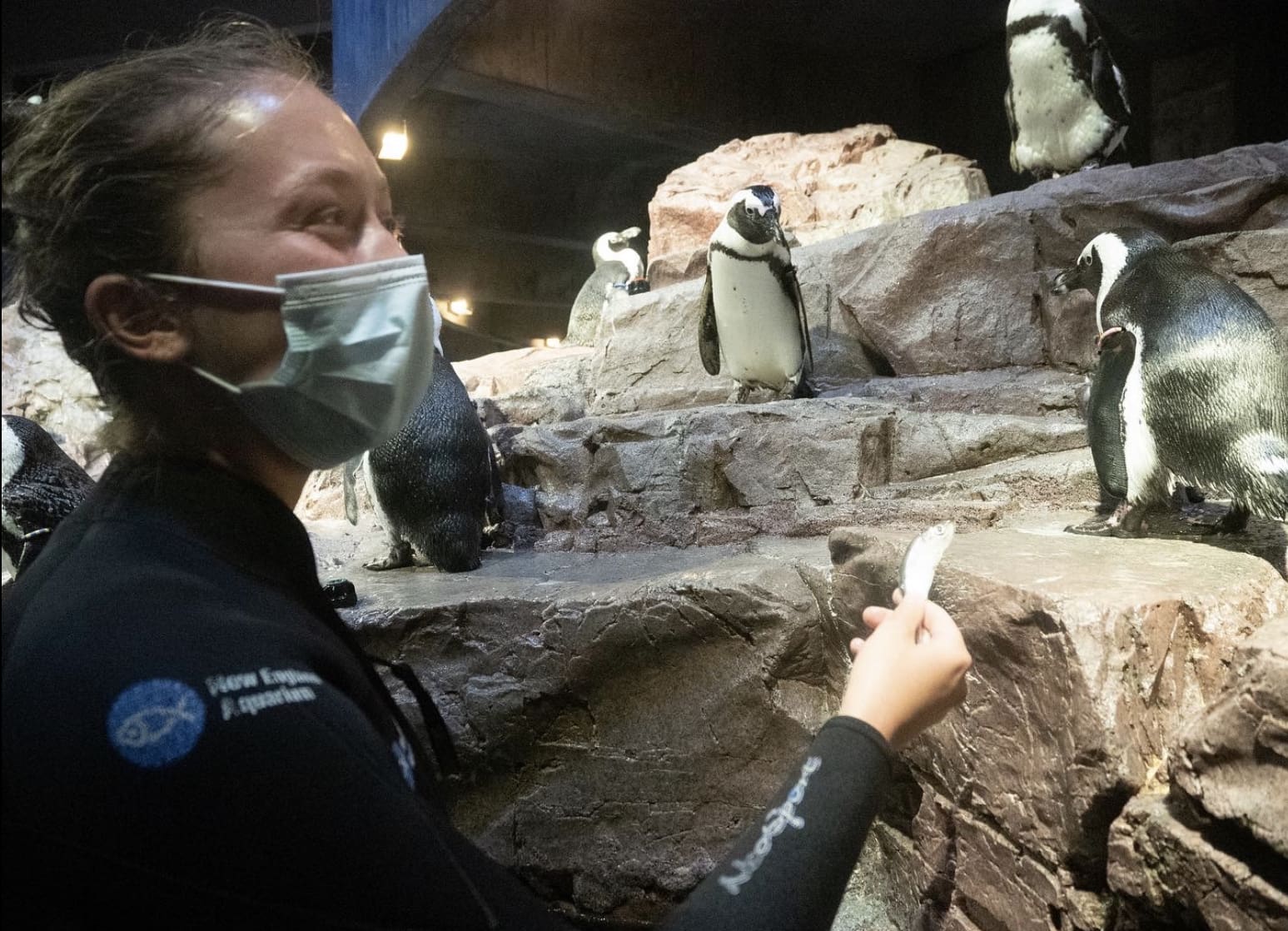 Today is my first day at the New England Aquarium. I will be coming here for the next week and working in a different department everyday. Today is the penguin exhibit! I met Dan Dolan, who was a volunteer diver at the aquarium for years, and he showed me where to park and took me on a quick tour. He then handed me off to Lila from the penguin exhibit and I got my day started. There was an awesome group of people working in penguins, and they were all so welcoming. I knew it was going to be a great day. Olivia, an intern for the penguin exhibit who was my age, was picking through smelt (a type of fish) to prepare it for feeding. She had to compost any fish that was missing a tail or head, or had any holes in it. This is because they didn’t want any contaminated food getting to the penguins. I then got suited up in a 7 millimeter wetsuit and booties and showered off to make sure I wasn’t bringing anything into the exhibit that would contaminate it.Â