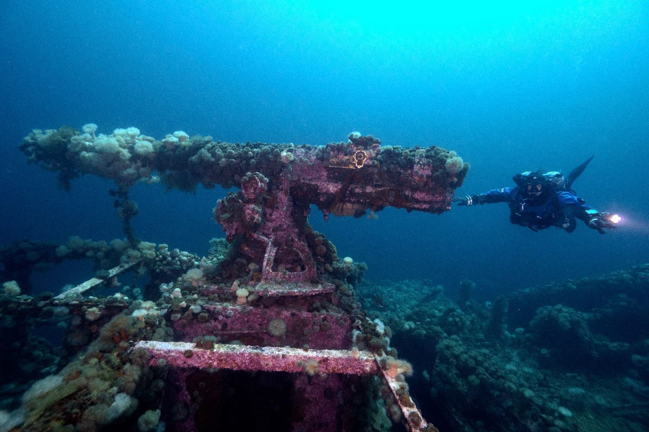 The conditions were gorgeous on this dive, and the anemones that covered every surface of the wreck were in “full bloom,” as Debbie put it. We swam from the bow to the stern of this impressive 400-foot wreck, and I was fascinated by the massive gun mounted on the stern. It was absolutely covered in frilled and colorful anemones.
