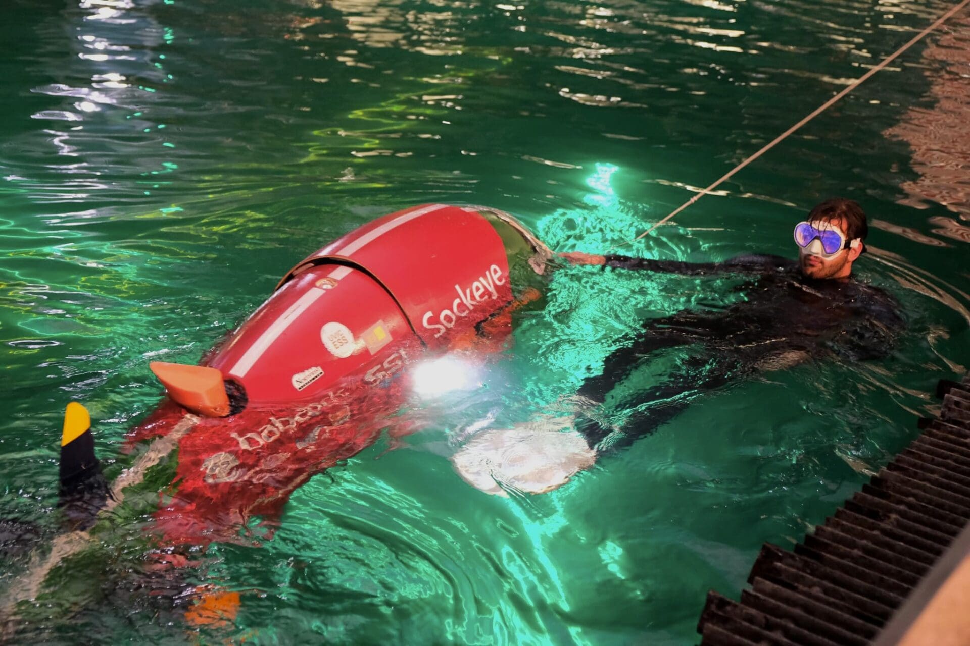 Once the checkouts had been completed, it was time for something completely different. The race course consists of a 100 yard straight away, and at the point when a races was ended for any reason, the pilot would be safely removed from the sub, and it needed to be brought back to the starting area. The subs were often brought back utilizing a combination of a tow line from the dock, as well as a swimmer in the water to prevent the sub from dragging agains the concrete walls. My job for the afternoon would be to both observe teams and ensure they were safe, as well as assist in swimming submarines in, should it be an extremely heavy vessel, or if the team had a limited number of contestants available to help. As the day went on, teams become more and more efficient at retrieving their subs, and were even creative enough to through buoyant objects such as pool noodles into the submarine to keep in on the surface and easy the efforts of the swimmers.