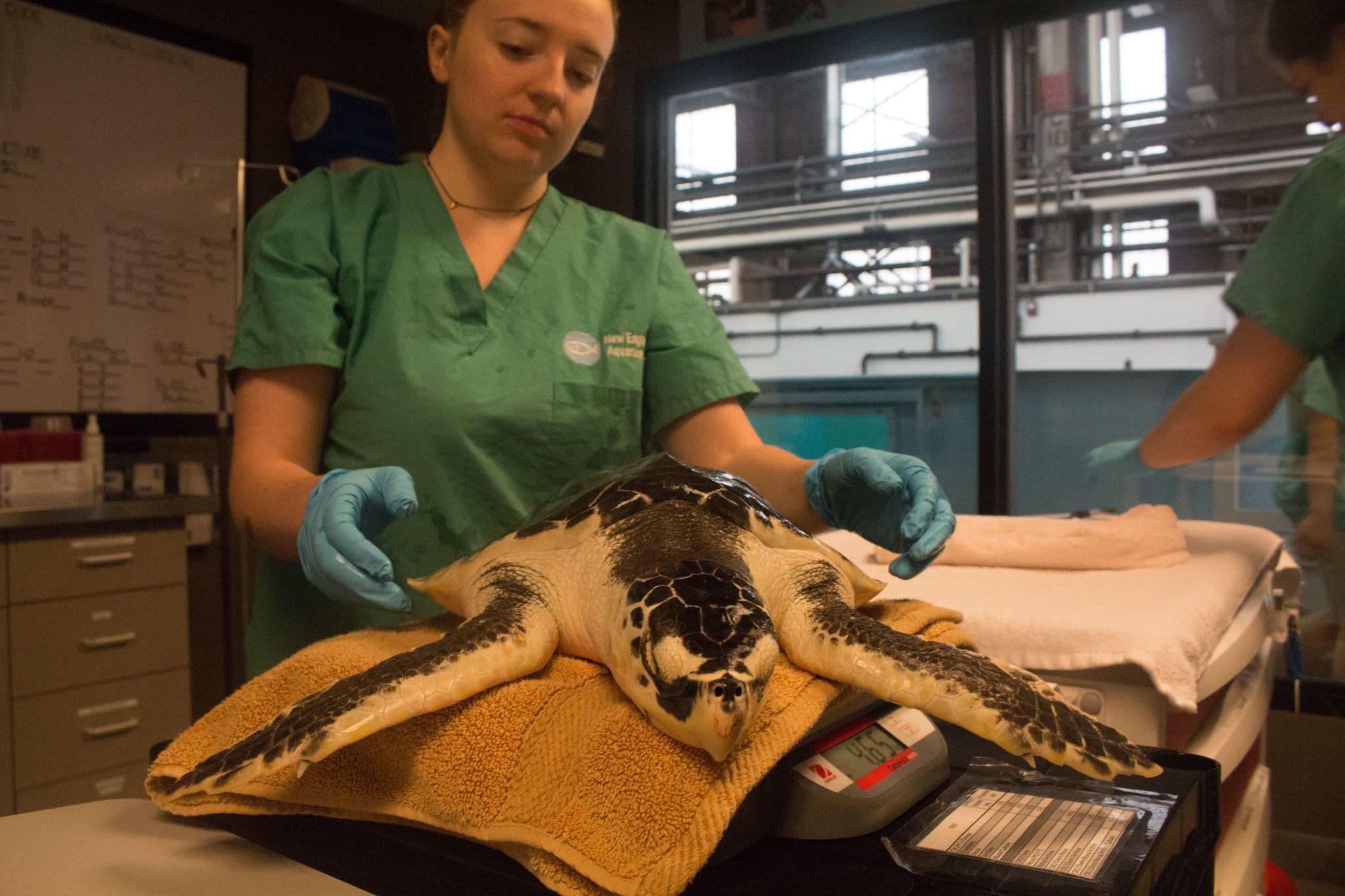 My last day the the New England Aquarium was spent working with the rescued sea turtles at the rehab center in Quincy. A discrete industrial building, that looks nothing like it would house animals, is filled with quarantined animals, the sharks and rays that had been removed days before and the rescued turtles. When I had arrived there were only 6 turtles left from the over 200 that had been rescued. Many are rescued from being cold stunned or getting stuck in the arm of Cape Cod trying to migrate. They were divided into four tanks. Each gets regular check ups and is fed a certain diet, yet another example of how caring and individualized the aquarium is. While I was there I watched as turtles got check ups, weighing them, checking their vitals and looking at their shell making sure it was all healthy and didn’t have dents or scratches. After taking care of the turtles we headed down the wharf to get a few live crabs from the trap to give to the turtles as something of enrichment and to keep them on a healthy diet. The turtles can be pretty picky eaters and would just pass by the crab while other would lunge at it.